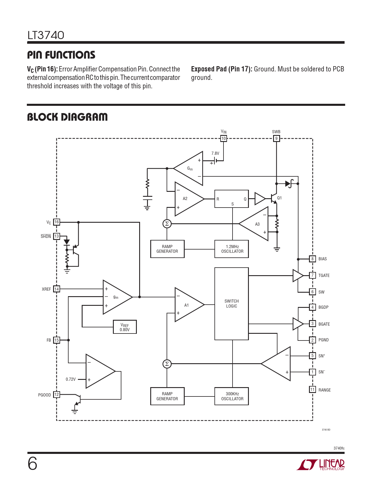 VIN SWB 10 9 7.8V + + Gm – – A2 Q1 R Q S + – V 16 C Σ A3 + SHDN 13 RAMP 1.2MHz GENERATOR OSCILLATOR 8 BIAS 7 TGATE XREF 14 + 6 SW – gm – SWITCH + A1 LOGIC 4 BGDP + V 3 BGATE REF 0.80V FB 15 2 PGND – 5 SN+ – Σ + 1 SN– 0.72V + 11 RANGE PGOOD 12 RAMP 300KHz GENERATOR OSCILLATOR 3740 BD 3740fc 6