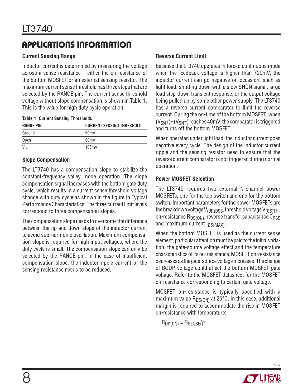Inductor current is determined by measuring the voltage Because the LT3740 operates in forced continuous mode across a sense resistance – either the on-resistance of when the feedback voltage is higher than 720mV, the the bottom MOSFET or an external sensing resistor. The inductor current can go negative on occasion, such as maximum current sense threshold has three steps that are light load, shutting down with a slow SHDN signal, large selected by the RANGE pin. The current sense threshold load step-down transient response, or the output voltage voltage without slope compensation is shown in Table 1. being pulled up by some other power supply. The LT3740 This is the value for high duty cycle operation. has a reverse current comparator to limit the reverse current. During the on-time of the bottom MOSFET, when