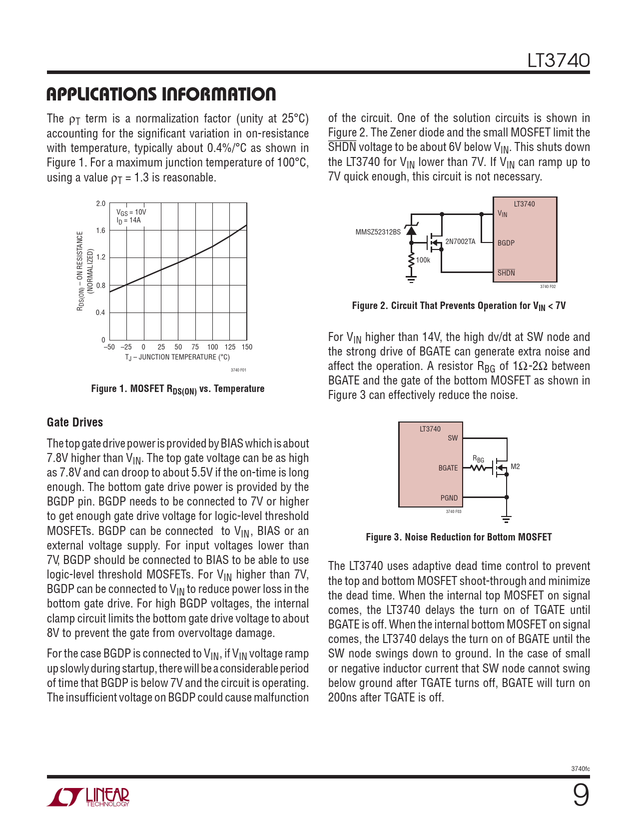 0.4 0 For VIN higher than 14V, the high dv/dt at SW node and –50 –25 0 25 50 75 100 125 150 the strong drive of BGATE can generate extra noise and TJ – JUNCTION TEMPERATURE (°C) affect the operation. A resistor R 3740 F01 BG of 1Ω-2Ω between BGATE and the gate of the bottom MOSFET as shown in