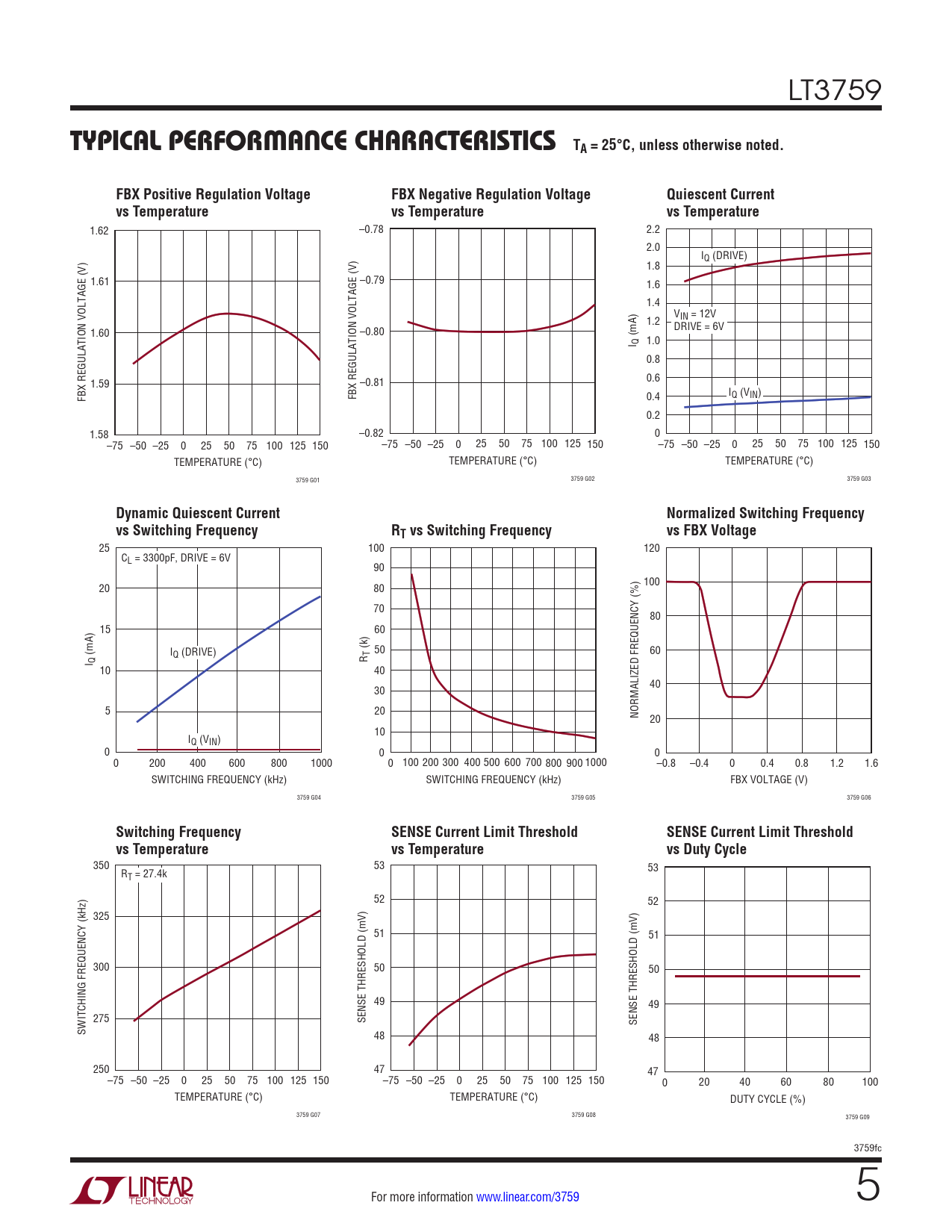 1.62 –0.78 2.2 2.0 IQ (DRIVE) 1.8 1.61 –0.79 1.6 1.4 V 1.2 IN = 12V 1.60 –0.80 DRIVE = 6V (mA) I Q 1.0 0.8 1.59 –0.81 0.6 FBX REGULATION VOLTAGE (V) FBX REGULATION VOLTAGE (V) 0.4 IQ (VIN) 0.2 1.58 –0.82 0 –75 –50 –25 0 25 50 75 100 125 150 –75 –50 –25 0 25 50 75 100 125 150 –75 –50 –25 0 25 50 75 100 125 150 TEMPERATURE (°C) TEMPERATURE (°C) TEMPERATURE (°C) 3759 G01 3759 G02 3759 G03
