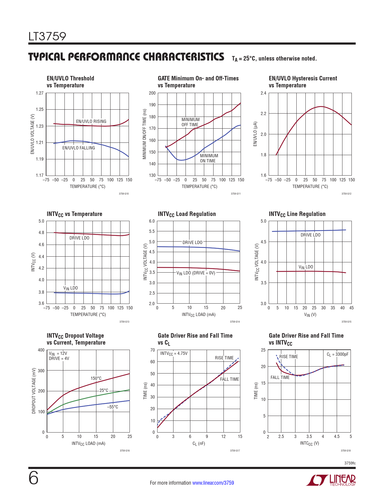 5.0 6.0 5.0 5.5 4.8 DRIVE LDO DRIVE LDO 5.0 DRIVE LDO 4.6 4.5 4.5 (V) 4.4 CC 4.0 4.0 VOLTAGE (V) VOLTAGE (V) V INTV 4.2 IN LDO CC 3.5 V CC IN LDO (DRIVE = 0V) 4.0 INTV INTV 3.0 3.5 VIN LDO 3.8 2.5 3.6 2.0 3.0 –75 –50 –25 0 25 50 75 100 125 150 0 5 10 15 20 25 0 5 10 15 20 25 30 35 40 45 TEMPERATURE (°C) INTVCC LOAD (mA) VIN (V) 3759 G13 3759 G14 3759 G15
