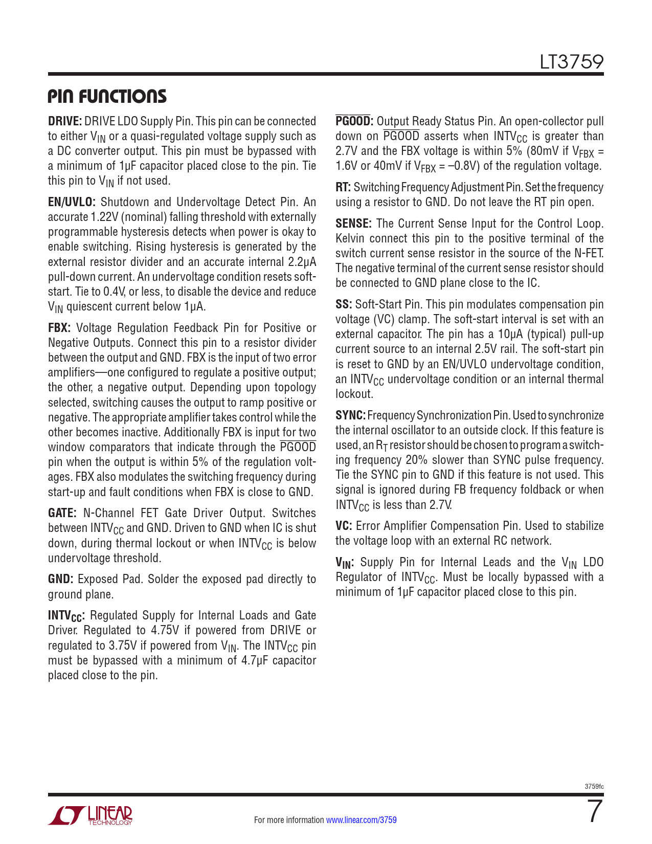 LT3759 PIN FUNCTIONSDRIVE: DRIVE LDO Supply Pin. This pin can be connected PGOOD: Output Ready Status Pin. An open-collector pull to either VIN or a quasi-regulated voltage supply such as down on PGOOD asserts when INTVCC is greater than a DC converter output. This pin must be bypassed with 2.7V and the FBX voltage is within 5% (80mV if VFBX = a minimum of 1µF capacitor placed close to the pin. Tie 1.6V or 40mV if VFBX = –0.8V) of the regulation voltage. this pin to VIN if not used. RT: Switching Frequency Adjustment Pin. Set the frequency EN/UVLO: Shutdown and Undervoltage Detect Pin. An using a resistor to GND. Do not leave the RT pin open. accurate 1.22V (nominal) falling threshold with externally SENSE: The Current Sense Input for the Control Loop. programmable hysteresis detects when power is okay to Kelvin connect this pin to the positive terminal of the enable switching. Rising hysteresis is generated by the switch current sense resistor in the source of the N-FET. external resistor divider and an accurate internal 2.2μA The negative terminal of the current sense resistor should pull-down current. An undervoltage condition resets soft- be connected to GND plane close to the IC. start. Tie to 0.4V, or less, to disable the device and reduce VIN quiescent current below 1μA. SS: Soft-Start Pin. This pin modulates compensation pin voltage (VC) clamp. The soft-start interval is set with an FBX: Voltage Regulation Feedback Pin for Positive or external capacitor. The pin has a 10µA (typical) pull-up Negative Outputs. Connect this pin to a resistor divider current source to an internal 2.5V rail. The soft-start pin between the output and GND. FBX is the input of two error is reset to GND by an EN/UVLO undervoltage condition, amplifiers—one configured to regulate a positive output; an INTV the other, a negative output. Depending upon topology CC undervoltage condition or an internal thermal lockout. selected, switching causes the output to ramp positive or negative. The appropriate amplifier takes control while the SYNC: Frequency Synchronization Pin. Used to synchronize other becomes inactive. Additionally FBX is input for two the internal oscillator to an outside clock. If this feature is window comparators that indicate through the PGOOD used, an RT resistor should be chosen to program a switch- pin when the output is within 5% of the regulation volt- ing frequency 20% slower than SYNC pulse frequency. ages. FBX also modulates the switching frequency during Tie the SYNC pin to GND if this feature is not used. This start-up and fault conditions when FBX is close to GND. signal is ignored during FB frequency foldback or when INTV GATE: N-Channel FET Gate Driver Output. Switches CC is less than 2.7V. between INTVCC and GND. Driven to GND when IC is shut VC: Error Amplifier Compensation Pin. Used to stabilize down, during thermal lockout or when INTVCC is below the voltage loop with an external RC network. undervoltage threshold. VIN: Supply Pin for Internal Leads and the VIN LDO GND: Exposed Pad. Solder the exposed pad directly to Regulator of INTVCC. Must be locally bypassed with a ground plane. minimum of 1µF capacitor placed close to this pin. INTVCC: Regulated Supply for Internal Loads and Gate Driver. Regulated to 4.75V if powered from DRIVE or regulated to 3.75V if powered from VIN. The INTVCC pin must be bypassed with a minimum of 4.7µF capacitor placed close to the pin. 3759fc For more information www.linear.com/3759 7 Document Outline Features Applications Description Typical Application Absolute Maximum Ratings Pin Configuration Order Information Electrical Characteristics Typical Performance Characteristics Pin Functions Block Diagram Applications Information Typical Applications Package Description Revision History Related Parts
