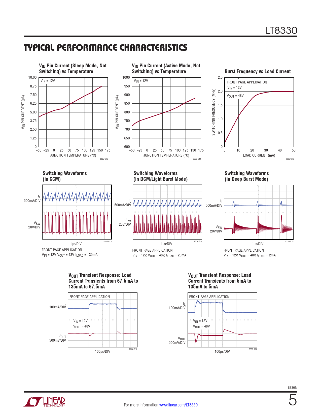 10.00 1000 2.5 VIN = 12V VIN = 12V FRONT PAGE APPLICATION 8.75 950 VIN = 12V 2.0 7.50 900 VOUT = 48V 6.25 850 1.5 5.00 800 3.75 1.0 PIN CURRENT (µA) 750 PIN CURRENT (µA) V IN 2.50 V IN 700 0.5 SWITCHING FREQUENCY (MHz) 1.25 650 0 600 0 –50 –25 0 25 50 75 100 125 150 175 –50 –25 0 25 50 75 100 125 150 175 0 10 20 30 40 50 JUNCTION TEMPERATURE (°C) JUNCTION TEMPERATURE (°C) LOAD CURRENT (mA) 8330 G10 8330 G11 8330 G12