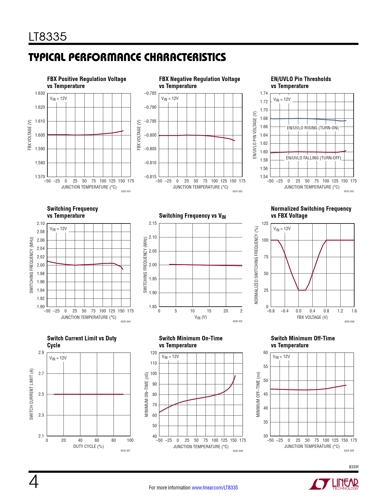 2.10 2.15 125 VIN = 12V V 2.08 IN = 12V 2.10 2.06 100 2.04 2.05 2.02 75 2.00 2.00 1.98 50 1.95 1.96 1.94 SWITCHING FREQUENCY (MHz) SWITCHING FREQUENCY (MHz) 1.90 25 1.92 NORMALIZED SWITCHING FREQUENCY (%) 1.90 1.85 0 –50 –25 0 25 50 75 100 125 150 175 0 5 10 15 20 25 –0.8 –0.4 0.0 0.4 0.8 1.2 1.6 JUNCTION TEMPERATURE (°C) VIN (V) FBX VOLTAGE (V) 8335 G04 8335 G05 8335 G06