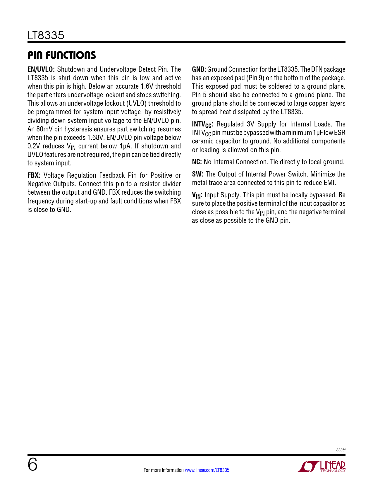 LT8335 PIN FUNCTIONS EN/UVLO: Shutdown and Undervoltage Detect Pin. The GND: Ground Connection for the LT8335. The DFN package LT8335 is shut down when this pin is low and active has an exposed pad (Pin 9) on the bottom of the package. when this pin is high. Below an accurate 1.6V threshold This exposed pad must be soldered to a ground plane. the part enters undervoltage lockout and stops switching. Pin 5 should also be connected to a ground plane. The This allows an undervoltage lockout (UVLO) threshold to ground plane should be connected to large copper layers be programmed for system input voltage by resistively to spread heat dissipated by the LT8335. dividing down system input voltage to the EN/UVLO pin. INTV An 80mV pin hysteresis ensures part switching resumes CC: Regulated 3V Supply for Internal Loads. The INTV when the pin exceeds 1.68V. EN/UVLO pin voltage below CC pin must be bypassed with a minimum 1µF low ESR ceramic capacitor to ground. No additional components 0.2V reduces VIN current below 1µA. If shutdown and or loading is allowed on this pin. UVLO features are not required, the pin can be tied directly to system input. NC: No Internal Connection. Tie directly to local ground. FBX: Voltage Regulation Feedback Pin for Positive or SW: The Output of Internal Power Switch. Minimize the Negative Outputs. Connect this pin to a resistor divider metal trace area connected to this pin to reduce EMI. between the output and GND. FBX reduces the switching V frequency during start-up and fault conditions when FBX IN: Input Supply. This pin must be locally bypassed. Be sure to place the positive terminal of the input capacitor as is close to GND. close as possible to the VIN pin, and the negative terminal as close as possible to the GND pin. 8335f 6 For more information www.linear.com/LT8335