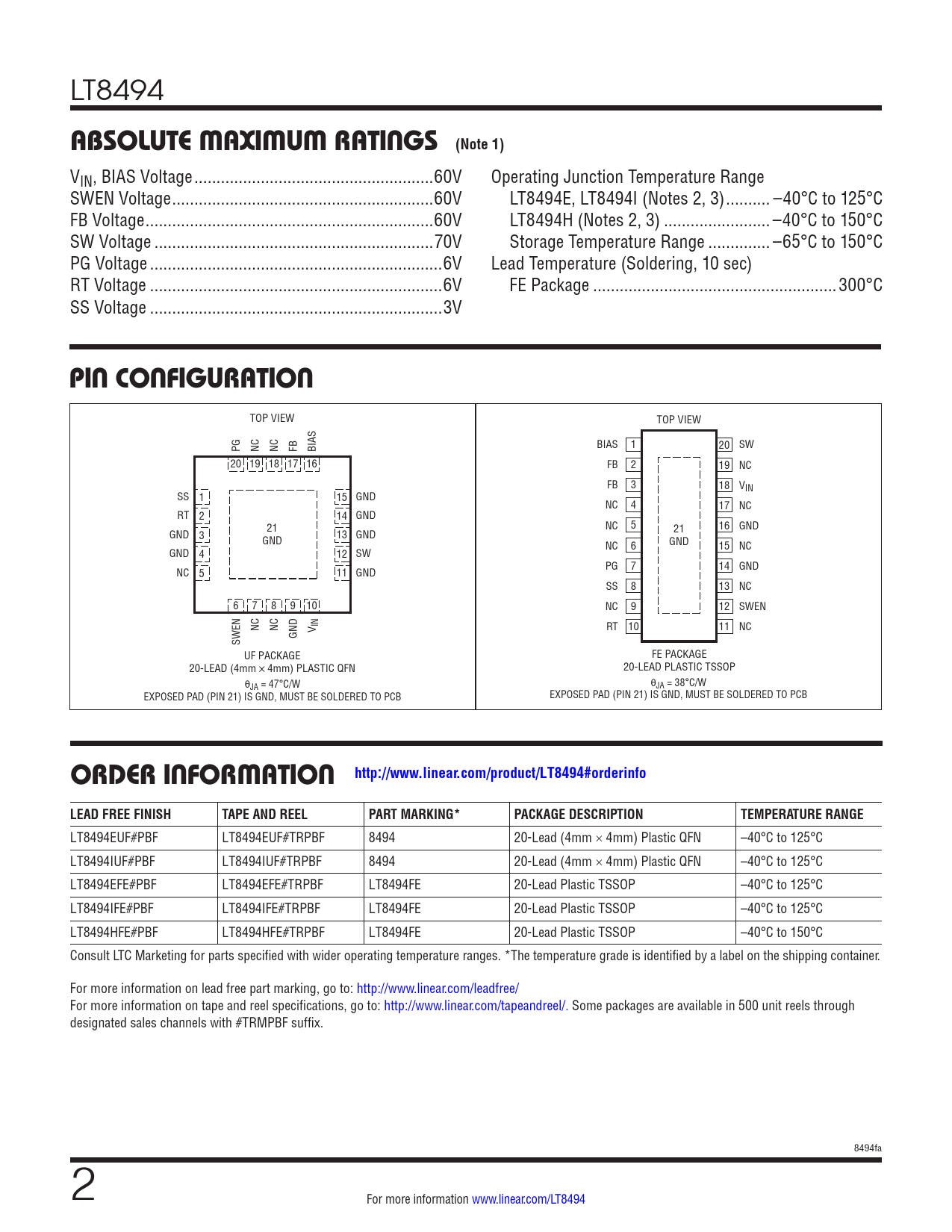LT8494 ABSOLUTE MAXIMUM RATINGS (Note 1) VIN, BIAS Voltage ..60V Operating Junction Temperature Range SWEN Voltage ...60V LT8494E, LT8494I (Notes 2, 3) .. –40°C to 125°C FB Voltage ...60V LT8494H (Notes 2, 3) .. –40°C to 150°C SW Voltage ...70V Storage Temperature Range .. –65°C to 150°C PG Voltage ..6V Lead Temperature (Soldering, 10 sec) RT Voltage ..6V FE Package ...300°C SS Voltage ..3V PIN CONFIGURATION TOP VIEW TOP VIEW PG NC NC FB BIAS BIAS 1 20 SW 20 19 18 17 16 FB 2 19 NC FB 3 18 VIN SS 1 15 GND NC 4 17 NC RT 2 14 GND 21 NC 5 16 GND GND 3 21 GND 13 GND NC 6 GND 15 NC GND 4 12 SW PG 7 NC 14 GND 5 11 GND SS 8 13 NC 6 7 8 9 10 NC 9 12 SWEN NC NC RT 10 11 NC GND V IN SWEN UF PACKAGE FE PACKAGE 20-LEAD (4mm × 4mm) PLASTIC QFN 20-LEAD PLASTIC TSSOP θJA = 47°C/W θJA = 38°C/W EXPOSED PAD (PIN 21) IS GND, MUST BE SOLDERED TO PCB EXPOSED PAD (PIN 21) IS GND, MUST BE SOLDERED TO PCB ORDER INFORMATION http://www.linear.com/product/LT8494#orderinfoLEAD FREE FINISHTAPE AND REELPART MARKING*PACKAGE DESCRIPTIONTEMPERATURE RANGE LT8494EUF#PBF LT8494EUF#TRPBF 8494 20-Lead (4mm × 4mm) Plastic QFN –40°C to 125°C LT8494IUF#PBF LT8494IUF#TRPBF 8494 20-Lead (4mm × 4mm) Plastic QFN –40°C to 125°C LT8494EFE#PBF LT8494EFE#TRPBF LT8494FE 20-Lead Plastic TSSOP –40°C to 125°C LT8494IFE#PBF LT8494IFE#TRPBF LT8494FE 20-Lead Plastic TSSOP –40°C to 125°C LT8494HFE#PBF LT8494HFE#TRPBF LT8494FE 20-Lead Plastic TSSOP –40°C to 150°C Consult LTC Marketing for parts specified with wider operating temperature ranges. *The temperature grade is identified by a label on the shipping container. For more information on lead free part marking, go to: http://www.linear.com/leadfree/ For more information on tape and reel specifications, go to: http://www.linear.com/tapeandreel/. Some packages are available in 500 unit reels through designated sales channels with #TRMPBF suffix. 8494fa 2 For more information www.linear.com/LT8494 Document Outline Features Applications Typical Application Description Absolute Maximum Ratings Pin Configuration Order Information Electrical Characteristics Typical Performance Characteristics Pin Functions Block Diagram Operation Applications Information Typical Application Related Parts