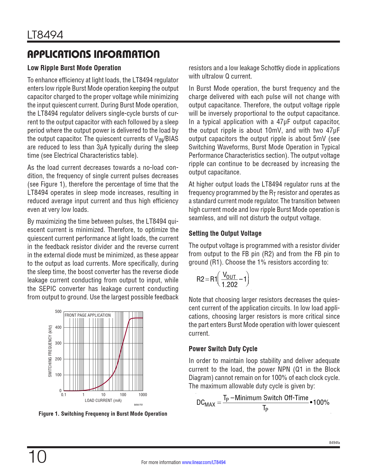 APPLICATIONS INFORMATION Low Ripple Burst Mode Operation Setting the Output Voltage Power Switch Duty Cycle
