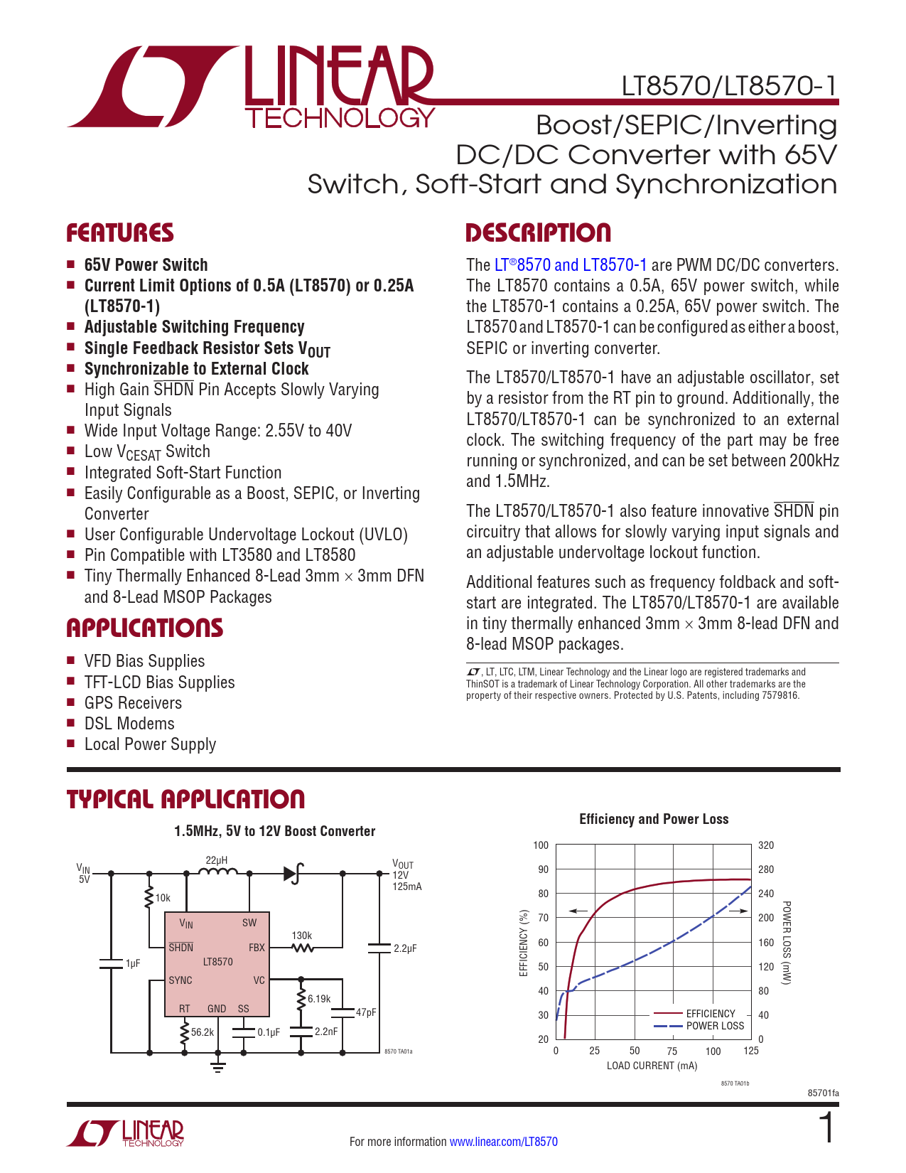 LT8570/LT8570-1 Boost/SEPIC/Inverting DC/DC Converter with 65V Switch, Soft-Start and Synchronization FEATURESDESCRIPTION n 65V Power Switch The LT®8570 and LT8570-1 are PWM DC/DC converters. n Current Limit Options of 0.5A (LT8570) or 0.25A The LT8570 contains a 0.5A, 65V power switch, while (LT8570-1) the LT8570-1 contains a 0.25A, 65V power switch. The n Adjustable Switching Frequency LT8570 and LT8570-1 can be configured as either a boost, n Single Feedback Resistor Sets VOUT SEPIC or inverting converter. n Synchronizable to External Clock The LT8570/LT8570-1 have an adjustable oscillator, set n High Gain SHDN Pin Accepts Slowly Varying by a resistor from the RT pin to ground. Additionally, the Input Signals LT8570/LT8570-1 can be synchronized to an external n Wide Input Voltage Range: 2.55V to 40V clock. The switching frequency of the part may be free n Low VCESAT Switch running or synchronized, and can be set between 200kHz n Integrated Soft-Start Function and 1.5MHz. n Easily Configurable as a Boost, SEPIC, or Inverting Converter The LT8570/LT8570-1 also feature innovative SHDN pin n User Configurable Undervoltage Lockout (UVLO) circuitry that allows for slowly varying input signals and n Pin Compatible with LT3580 and LT8580 an adjustable undervoltage lockout function. n Tiny Thermally Enhanced 8-Lead 3mm × 3mm DFN Additional features such as frequency foldback and soft- and 8-Lead MSOP Packages start are integrated. The LT8570/LT8570-1 are available APPLICATIONS in tiny thermally enhanced 3mm × 3mm 8-lead DFN and 8-lead MSOP packages. n VFD Bias Supplies L, LT, LTC, LTM, Linear Technology and the Linear logo are registered trademarks and n TFT-LCD Bias Supplies ThinSOT is a trademark of Linear Technology Corporation. All other trademarks are the property of their respective owners. Protected by U.S. Patents, including 7579816. n GPS Receivers n DSL Modems n Local Power Supply TYPICAL APPLICATIONEfficiency and Power Loss1.5MHz, 5V to 12V Boost Converter 100 320 22µH VOUT VIN 90 280 12V 5V 125mA 80 240 10k POWER LOSS (mW) 70 200 VIN SW 130k 60 160 SHDN FBX 2.2µF 1µF LT8570 EFFICIENCY (%) 50 120 SYNC VC 40 80 6.19k RT GND SS 47pF 30 EFFICIENCY 40 POWER LOSS 56.2k 0.1µF 2.2nF 20 0 8570 TA01a 0 25 50 75 100 125 LOAD CURRENT (mA) 8570 TA01b 85701fa For more information www.linear.com/LT8570 1 Document Outline Features Applications Typical Application Description Absolute Maximum Ratings Pin Configuration Order Information Electrical Characteristics Typical Performance Characteristics Pin Functions Block Diagram Operation Applications Information Typical Applications Package Description Revision History Typical Application Related Parts