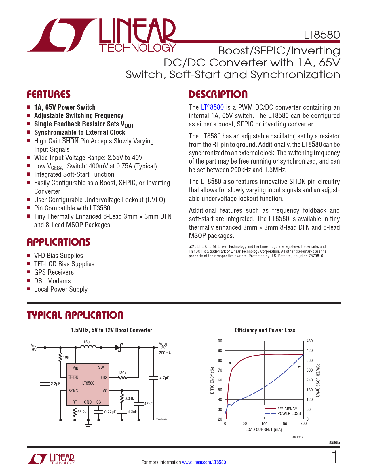 LT8580 Boost/SEPIC/Inverting DC/DC Converter with 1A, 65V Switch, Soft-Start and Synchronization FeaTuresDescripTion n 1A, 65V Power Switch The LT®8580 is a PWM DC/DC converter containing an n Adjustable Switching Frequency internal 1A, 65V switch. The LT8580 can be configured n Single Feedback Resistor Sets VOUT as either a boost, SEPIC or inverting converter. n Synchronizable to External Clock The LT8580 has an adjustable oscillator, set by a resistor n High Gain SHDN Pin Accepts Slowly Varying from the RT pin to ground. Additionally, the LT8580 can be Input Signals synchronized to an external clock. The switching frequency n Wide Input Voltage Range: 2.55V to 40V of the part may be free running or synchronized, and can n Low VCESAT Switch: 400mV at 0.75A (Typical) be set between 200kHz and 1.5MHz. n Integrated Soft-Start Function n Easily Configurable as a Boost, SEPIC, or Inverting The LT8580 also features innovative SHDN pin circuitry Converter that allows for slowly varying input signals and an adjust- n User Configurable Undervoltage Lockout (UVLO) able undervoltage lockout function. n Pin Compatible with LT3580 Additional features such as frequency foldback and n Tiny Thermally Enhanced 8-Lead 3mm × 3mm DFN soft-start are integrated. The LT8580 is available in tiny and 8-Lead MSOP Packages thermally enhanced 3mm × 3mm 8-lead DFN and 8-lead applicaTions MSOP packages. L, LT, LTC, LTM, Linear Technology and the Linear logo are registered trademarks and ThinSOT is a trademark of Linear Technology Corporation. All other trademarks are the n VFD Bias Supplies property of their respective owners. Protected by U.S. Patents, including 7579816. n TFT-LCD Bias Supplies n GPS Receivers n DSL Modems n Local Power Supply Typical applicaTion1.5MHz, 5V to 12V Boost ConverterEfficiency and Power Loss 100 480 15µH VOUT VIN 12V 5V 90 420 200mA 10k 80 360 POWER LOSS (mW) VIN SW 70 300 130k SHDN FBX 4.7µF 60 240 2.2µF LT8580 SYNC VC EFFICIENCY (%) 50 180 6.04k 40 120 RT GND SS 47pF 30 EFFICIENCY 60 56.2k 0.22µF 3.3nF POWER LOSS 8580 TA01a 20 0 0 50 100 150 200 LOAD CURRENT (mA) 8580 TA01b 8580fa For more information www.linear.com/LT8580 1 Document Outline Features Applications Typical Application Description Absolute Maximum Ratings Pin Configuration Order Information Electrical Characteristics Pin Functions Block Diagram Operation Applications Information Typical Applications Package Description Revision History Typical Application Related Parts