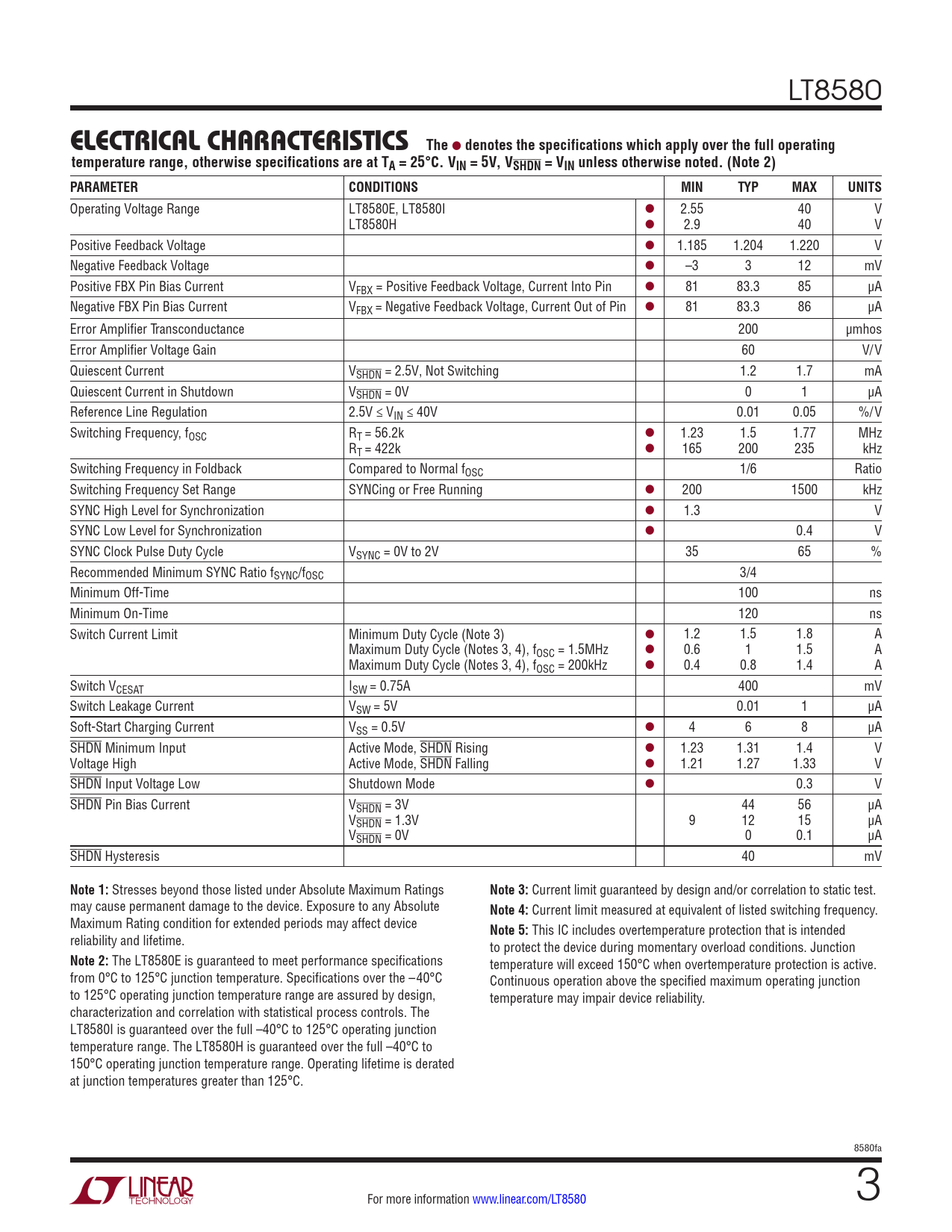 Operating Voltage Range LT8580E, LT8580I l 2.55 40 V LT8580H l 2.9 40 V Positive Feedback Voltage l 1.185 1.204 1.220 V Negative Feedback Voltage l –3 3 12 mV Positive FBX Pin Bias Current VFBX = Positive Feedback Voltage, Current Into Pin l 81 83.3 85 µA Negative FBX Pin Bias Current VFBX = Negative Feedback Voltage, Current Out of Pin l 81 83.3 86 µA Error Amplifier Transconductance 200 µmhos Error Amplifier Voltage Gain 60 V/V Quiescent Current VSHDN = 2.5V, Not Switching 1.2 1.7 mA Quiescent Current in Shutdown VSHDN = 0V 0 1 µA Reference Line Regulation 2.5V ≤ VIN ≤ 40V 0.01 0.05 %/V Switching Frequency, fOSC RT = 56.2k l 1.23 1.5 1.77 MHz RT = 422k l 165 200 235 kHz Switching Frequency in Foldback Compared to Normal fOSC 1/6 Ratio Switching Frequency Set Range SYNCing or Free Running l 200 1500 kHz SYNC High Level for Synchronization l 1.3 V SYNC Low Level for Synchronization l 0.4 V SYNC Clock Pulse Duty Cycle VSYNC = 0V to 2V 35 65 % Recommended Minimum SYNC Ratio fSYNC/fOSC 3/4 Minimum Off-Time 100 ns Minimum On-Time 120 ns Switch Current Limit Minimum Duty Cycle (Note 3) l 1.2 1.5 1.8 A Maximum Duty Cycle (Notes 3, 4), fOSC = 1.5MHz l 0.6 1 1.5 A Maximum Duty Cycle (Notes 3, 4), fOSC = 200kHz l 0.4 0.8 1.4 A Switch VCESAT ISW = 0.75A 400 mV Switch Leakage Current VSW = 5V 0.01 1 µA Soft-Start Charging Current VSS = 0.5V l 4 6 8 µA SHDN Minimum Input Active Mode, SHDN Rising l 1.23 1.31 1.4 V Voltage High Active Mode, SHDN Falling l 1.21 1.27 1.33 V SHDN Input Voltage Low Shutdown Mode l 0.3 V SHDN Pin Bias Current VSHDN = 3V 44 56 µA VSHDN = 1.3V 9 12 15 µA VSHDN = 0V 0 0.1 µA SHDN Hysteresis 40 mV