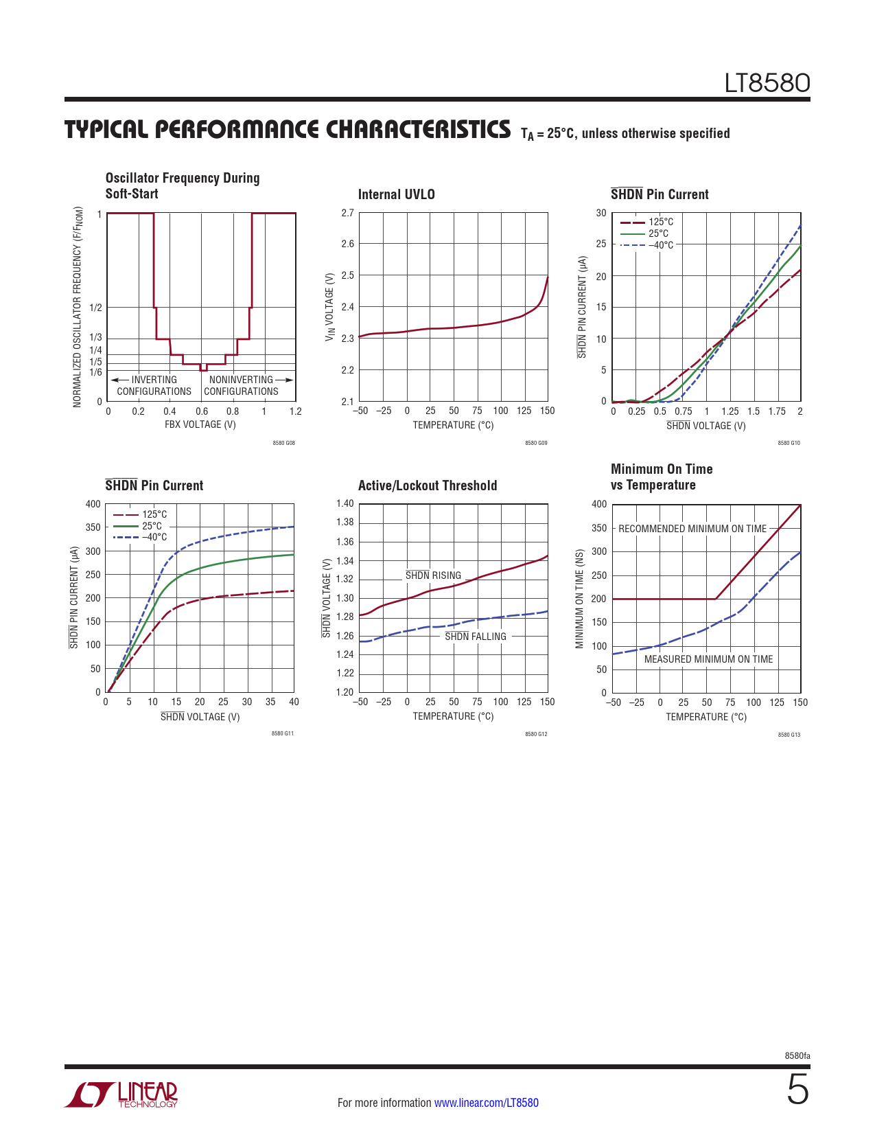 ) 1 2.7 30 NOM 125°C 25°C 2.6 25 –40°C 2.5 20 1/2 2.4 15 VOLTAGE (V) 1/3 PIN CURRENT (µA) V IN 2.3 10 1/4 SHDN 1/5 1/6 2.2 5 INVERTING NONINVERTING CONFIGURATIONS CONFIGURATIONS 0 NORMALIZED OSCILLATOR FREQUENCY (F/F 2.1 0 0 0.2 0.4 0.6 0.8 1 1.2 –50 –25 0 25 50 75 100 125 150 0 0.25 0.5 0.75 1 1.25 1.5 1.75 2 FBX VOLTAGE (V) TEMPERATURE (°C) SHDN VOLTAGE (V) 8580 G08 8580 G09 8580 G10