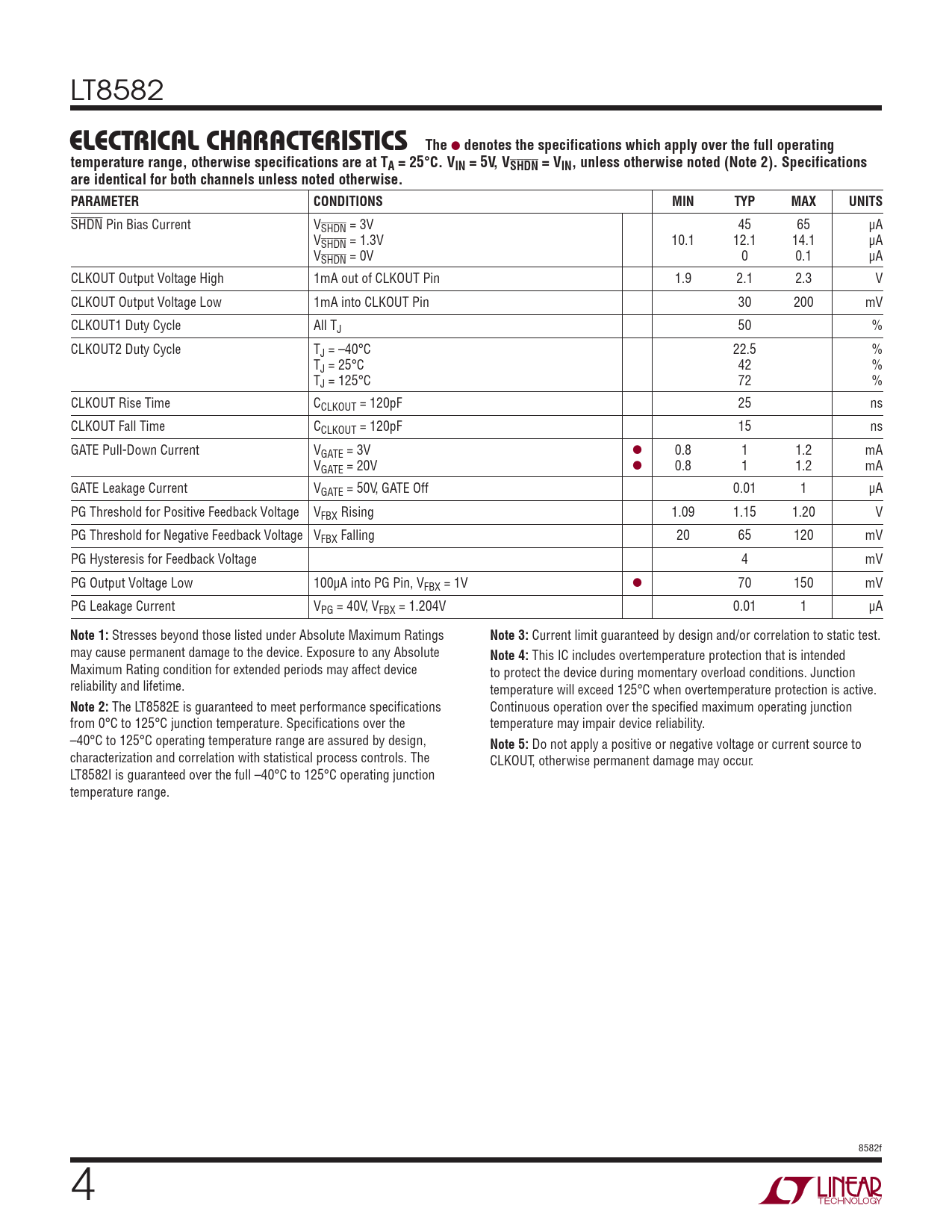 The LT8582E is guaranteed to meet performance specifications Continuous operation over the specified maximum operating junction from 0°C to 125°C junction temperature. Specifications over the temperature may impair device reliability. –40°C to 125°C operating temperature range are assured by design,