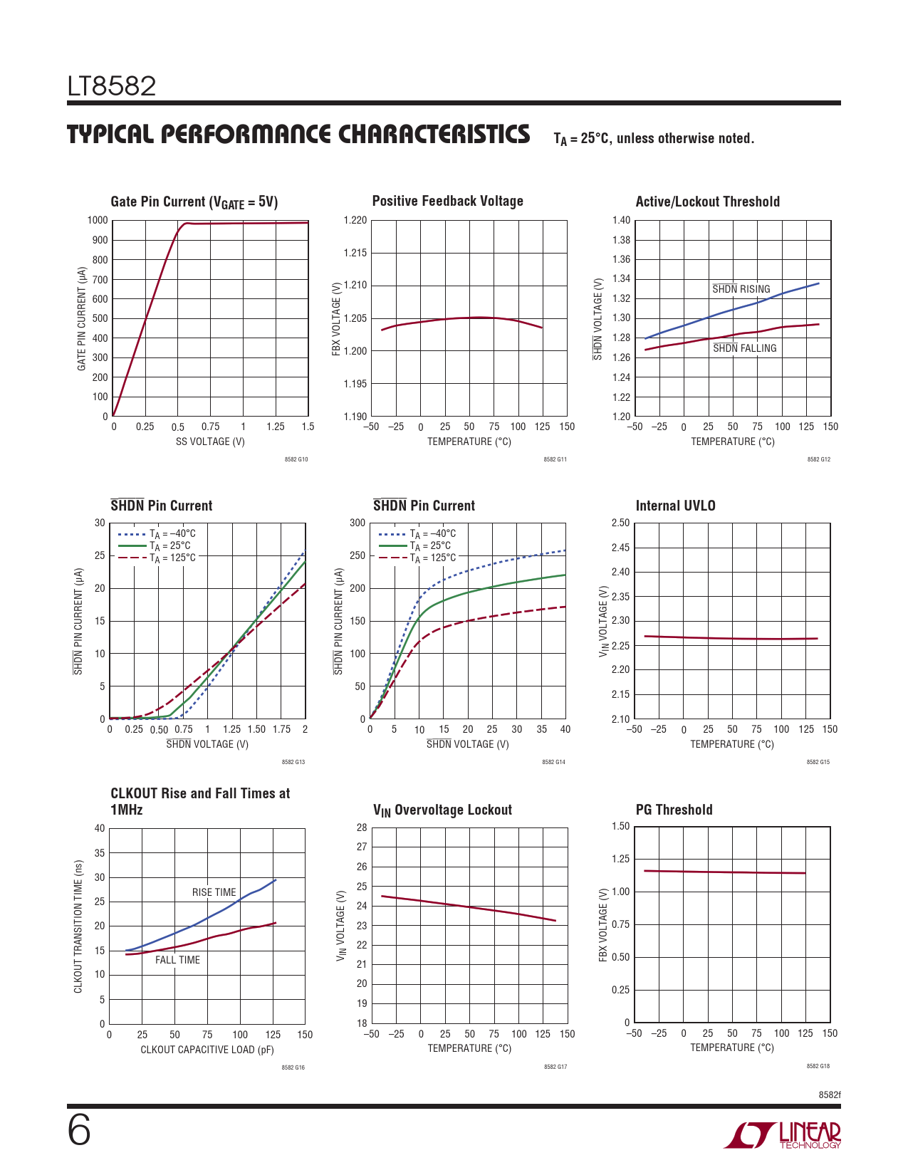 1000 1.220 1.40 900 1.38 1.215 800 1.36 700 1.34 1.210 SHDN RISING 600 1.32 500 1.205 1.30 VOLTAGE (V) 400 1.28 SHDN FBX VOLTAGE (V) 1.200 FALLING 300 SHDN 1.26 GATE PIN CURRENT (μA) 200 1.24 1.195 100 1.22 0 1.190 1.20 0 0.25 0.5 0.75 1 1.25 1.5 –50 –25 0 25 50 75 100 125 150 –50 –25 0 25 50 75 100 125 150 SS VOLTAGE (V) TEMPERATURE (°C) TEMPERATURE (°C) 8582 G10 8582 G11 8582 G12