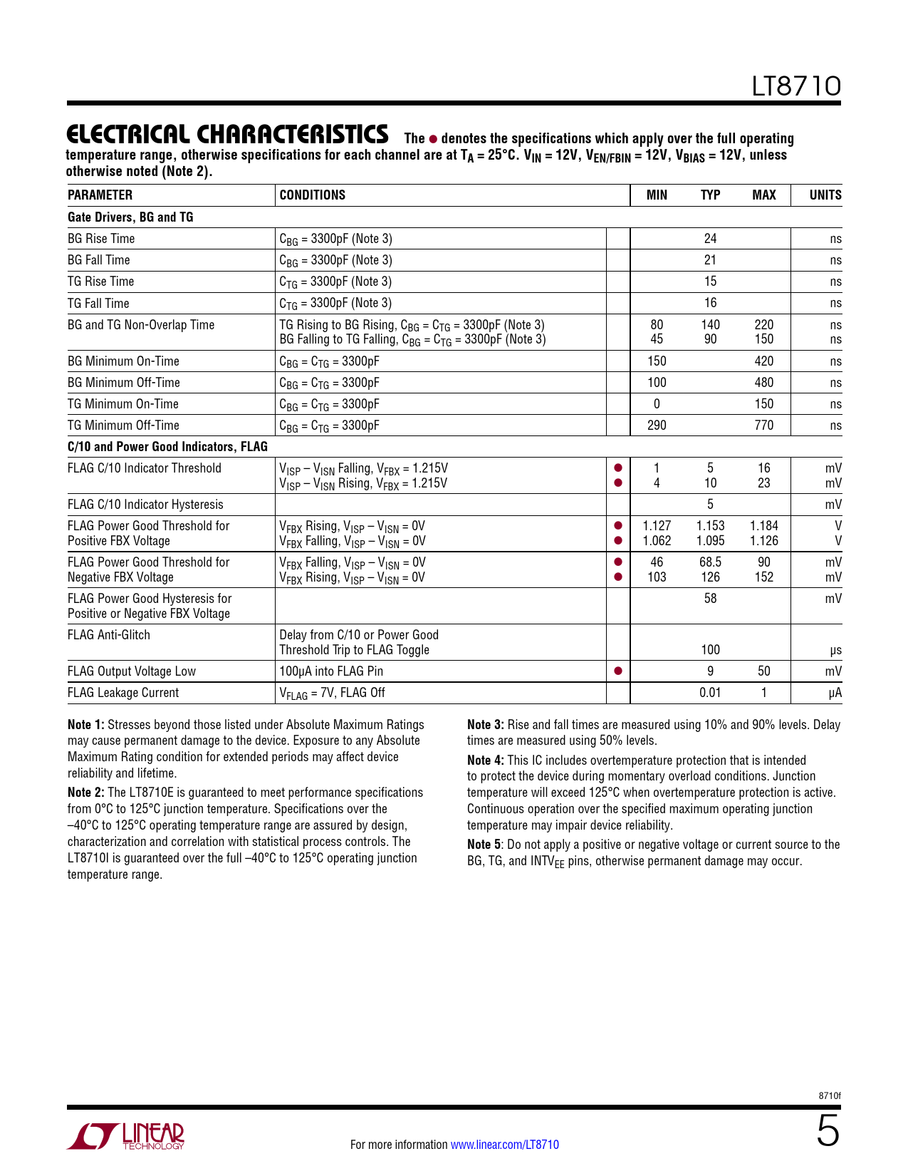 LT8710 e lecTrical characTerisTics The l denotes the specifications which apply over the full operatingtemperature range, otherwise specifications for each channel are at TA = 25°C. VIN = 12V, VEN/FBIN = 12V, VBIAS = 12V, unlessotherwise noted (Note 2).PARAMETERCONDITIONSMINTYPMAXUNITSGate Drivers, BG and TG BG Rise Time CBG = 3300pF (Note 3) 24 ns BG Fall Time CBG = 3300pF (Note 3) 21 ns TG Rise Time CTG = 3300pF (Note 3) 15 ns TG Fall Time CTG = 3300pF (Note 3) 16 ns BG and TG Non-Overlap Time TG Rising to BG Rising, CBG = CTG = 3300pF (Note 3) 80 140 220 ns BG Falling to TG Falling, CBG = CTG = 3300pF (Note 3) 45 90 150 ns BG Minimum On-Time CBG = CTG = 3300pF 150 420 ns BG Minimum Off-Time CBG = CTG = 3300pF 100 480 ns TG Minimum On-Time CBG = CTG = 3300pF 0 150 ns TG Minimum Off-Time CBG = CTG = 3300pF 290 770 ns C/10 and Power Good Indicators, FLAG FLAG C/10 Indicator Threshold VISP – VISN Falling, VFBX = 1.215V l 1 5 16 mV VISP – VISN Rising, VFBX = 1.215V l 4 10 23 mV FLAG C/10 Indicator Hysteresis 5 mV FLAG Power Good Threshold for VFBX Rising, VISP – VISN = 0V l 1.127 1.153 1.184 V Positive FBX Voltage VFBX Falling, VISP – VISN = 0V l 1.062 1.095 1.126 V FLAG Power Good Threshold for VFBX Falling, VISP – VISN = 0V l 46 68.5 90 mV Negative FBX Voltage VFBX Rising, VISP – VISN = 0V l 103 126 152 mV FLAG Power Good Hysteresis for 58 mV Positive or Negative FBX Voltage FLAG Anti-Glitch Delay from C/10 or Power Good Threshold Trip to FLAG Toggle 100 µs FLAG Output Voltage Low 100µA into FLAG Pin l 9 50 mV FLAG Leakage Current VFLAG = 7V, FLAG Off 0.01 1 µA Note 1: Stresses beyond those listed under Absolute Maximum Ratings Note 3: Rise and fall times are measured using 10% and 90% levels. Delay may cause permanent damage to the device. Exposure to any Absolute times are measured using 50% levels. Maximum Rating condition for extended periods may affect device Note 4: This IC includes overtemperature protection that is intended reliability and lifetime. to protect the device during momentary overload conditions. Junction Note 2: The LT8710E is guaranteed to meet performance specifications temperature will exceed 125°C when overtemperature protection is active. from 0°C to 125°C junction temperature. Specifications over the Continuous operation over the specified maximum operating junction –40°C to 125°C operating temperature range are assured by design, temperature may impair device reliability. characterization and correlation with statistical process controls. The Note 5 : Do not apply a positive or negative voltage or current source to the LT8710I is guaranteed over the full –40°C to 125°C operating junction BG, TG, and INTVEE pins, otherwise permanent damage may occur. temperature range. 8710f For more information www.linear.com/LT8710 5