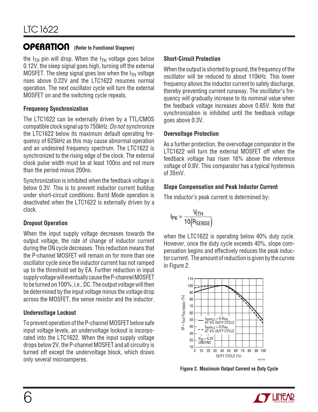 OUT(MAX) 60 /I 50 IRIPPLE = 0.4IPK To prevent operation of the P-channel MOSFET below safe OUT AT 5% DUTY CYCLE 40 I input voltage levels, an undervoltage lockout is incorpo- SF = I RIPPLE = 0.2IPK AT 5% DUTY CYCLE 30 rated into the LTC1622. When the input supply voltage V 20 IN = 4.2V drops below 2V, the P-channel MOSFET and all circuitry is UNSYNC 10 turned off except the undervoltage block, which draws 0 10 20 30 40 50 60 70 80 90 100 DUTY CYCLE (%) only several microamperes. 1622 F02