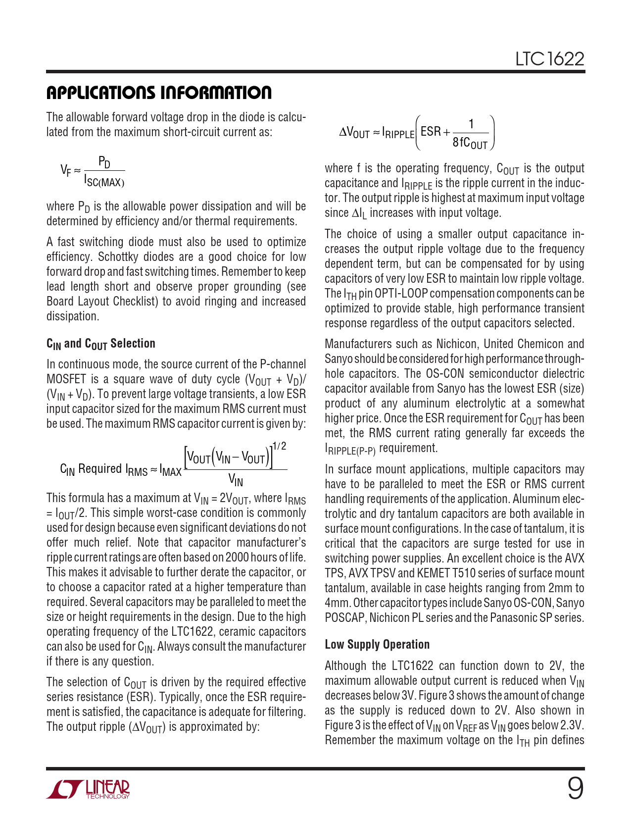 IN. Always consult the manufacturer if there is any question. Although the LTC1622 can function down to 2V, the The selection of C maximum allowable output current is reduced when V OUT is driven by the required effective IN series resistance (ESR). Typically, once the ESR require- decreases below 3V. Figure 3 shows the amount of change ment is satisfied, the capacitance is adequate for filtering. as the supply is reduced down to 2V. Also shown in The output ripple (∆V Figure 3 is the effect of V OUT) is approximated by: IN on VREF as VIN goes below 2.3V. Remember the maximum voltage on the ITH pin defines 9