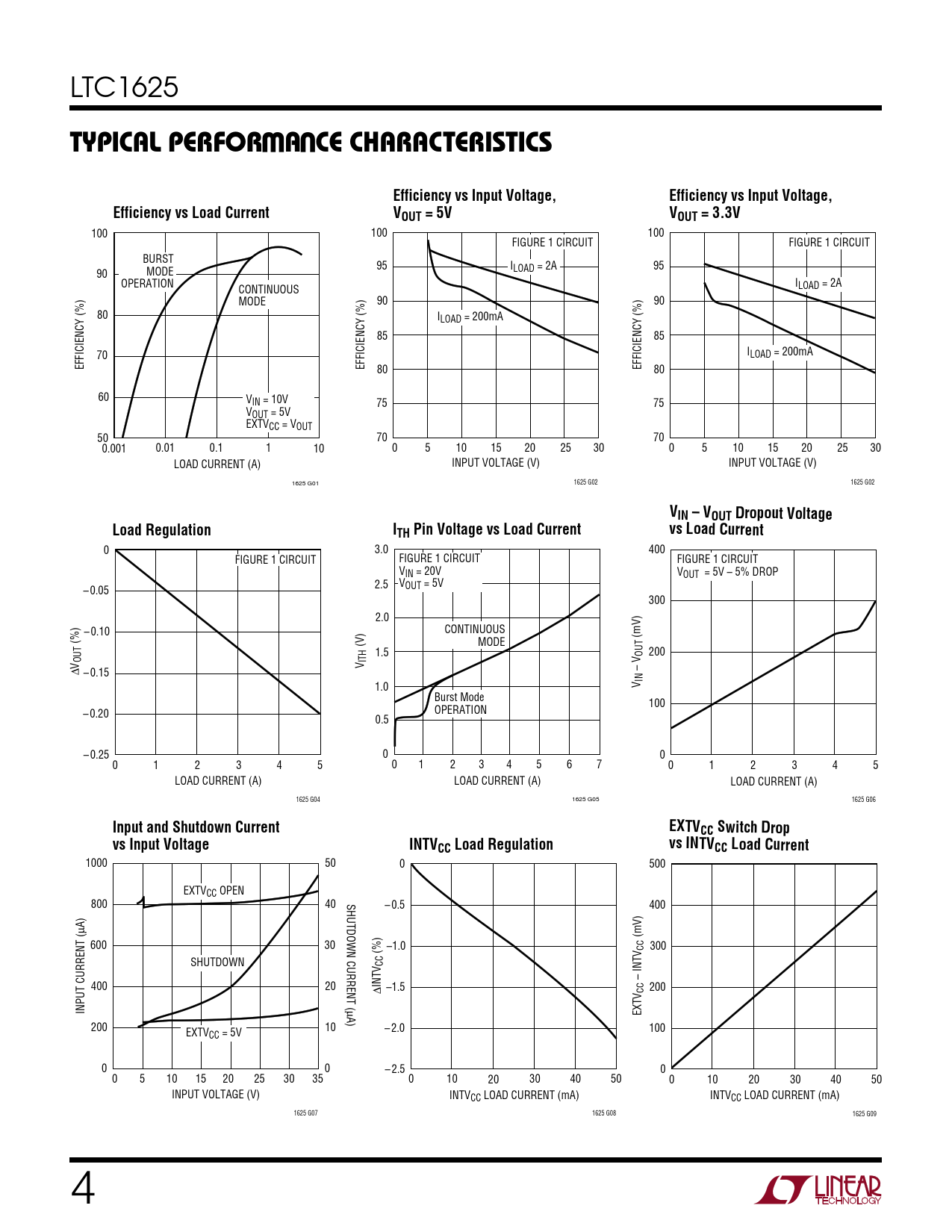 1000 50 0 500 EXTVCC OPEN SHUTDOWN CURRENT ( 800 40 – 0.5 400 µA) (mV) 600 30 –1.0 CC 300 (%) SHUTDOWN CC – INTV 400 20 ∆INTV –1.5 CC 200 INPUT CURRENT ( µA) EXTV 200 10 EXTV – 2.0 100 CC = 5V 0 0 – 2.5 0 0 5 10 15 20 25 30 35 0 10 20 30 40 50 0 10 20 30 40 50 INPUT VOLTAGE (V) INTV INTV CC LOAD CURRENT (mA) CC LOAD CURRENT (mA) 1625 G07 1625 G08 1625 G09 4