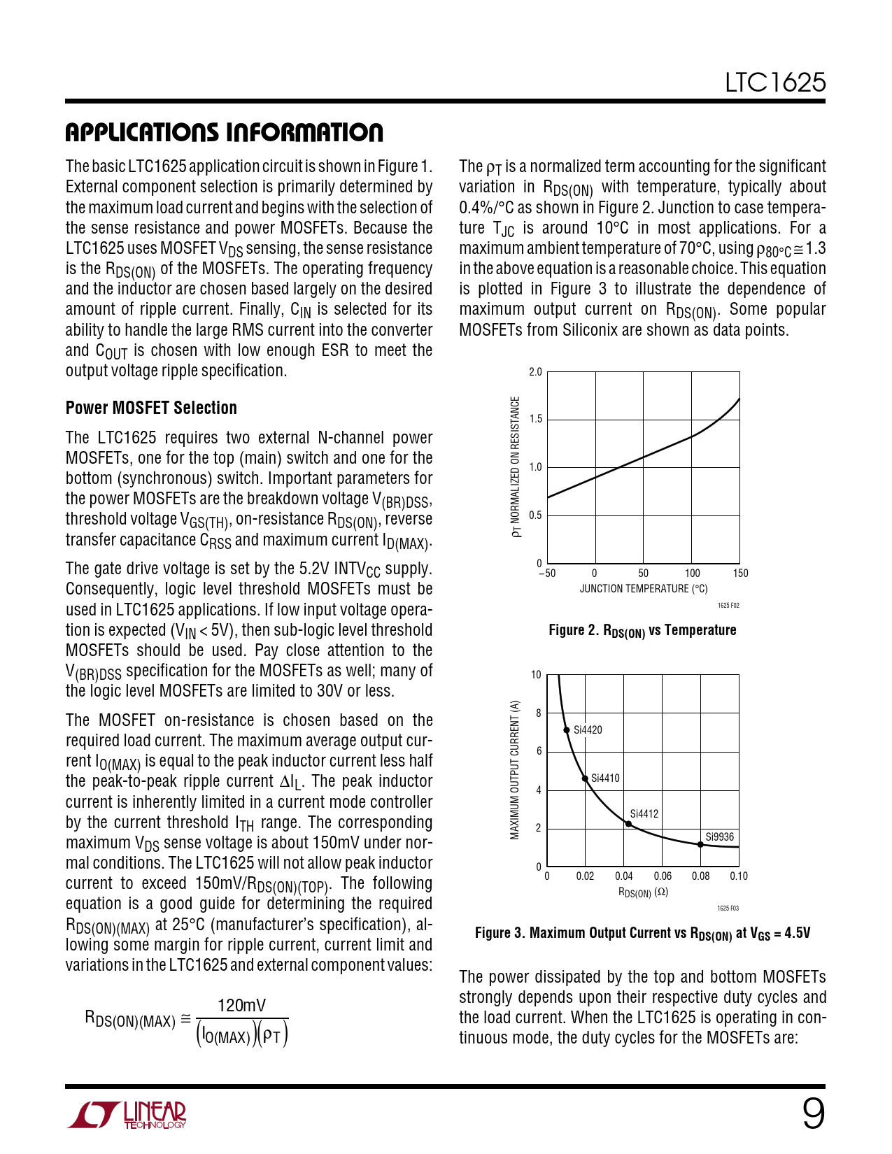 APPLICATIONS INFORMATION. Power MOSFET Selection. Figure 2. RDS(ON) vs Temperature. Figure 3. Maximum Output Current vs R