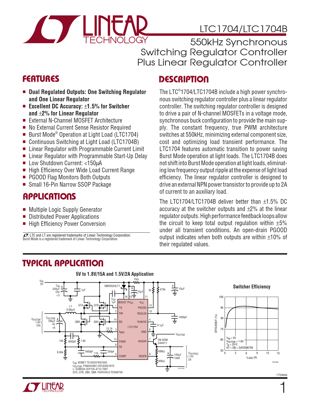 LTC1704/LTC1704B 550kHz Synchronous Switching Regulator Controller Plus Linear Regulator Controller UFEATURESDESCRIPTIO ■ Dual Regulated Outputs: One Switching Regulator The LTC®1704/LTC1704B include a high power synchro- and One Linear Regulator nous switching regulator controller plus a linear regulator ■ Excellent DC Accuracy: ± 1.5% for Switcher controller. The switching regulator controller is designed and ± 2% for Linear Regulator to drive a pair of N-channel MOSFETs in a voltage mode, ■ External N-Channel MOSFET Architecture synchronous buck configuration to provide the main sup- ■ No External Current Sense Resistor Required ply. The constant frequency, true PWM architecture ■ Burst Mode® Operation at Light Load (LTC1704) switches at 550kHz, minimizing external component size, ■ Continuous Switching at Light Load (LTC1704B) cost and optimizing load transient performance. The ■ Linear Regulator with Programmable Current Limit LTC1704 features automatic transition to power saving ■ Linear Regulator with Programmable Start-Up Delay Burst Mode operation at light loads. The LTC1704B does ■ Low Shutdown Current: <150µA not shift into Burst Mode operation at light loads, eliminat- ■ High Efficiency Over Wide Load Current Range ing low frequency output ripple at the expense of light load ■ PGOOD Flag Monitors Both Outputs efficiency. The linear regulator controller is designed to ■ Small 16-Pin Narrow SSOP Package drive an external NPN power transistor to provide up to 2A U of current to an auxiliary load. APPLICATIO S The LTC1704/LTC1704B deliver better than ±1.5% DC ■ Multiple Logic Supply Generator accuracy at the switcher outputs and ±2% at the linear ■ Distributed Power Applications regulator outputs. High performance feedback loops allow ■ High Efficiency Power Conversion the circuit to keep total output regulation within ±5% under all transient conditions. An open-drain PGOOD , LTC and LT are registered trademarks of Linear Technology Corporation. Burst Mode is a registered trademark of Linear Technology Corporation. output indicates when both outputs are within ±10% of their regulated values. UTYPICAL APPLICATIO5V to 1.8V/15A and 1.5V/2A Application 10Ω VIN 5V CIN MBR0520LT1 + + Switcher Efficiency 330µF + 1µF 5k 470k 10µF 10V 10µF ×3 16 15 11 100 CCP 1µF BOOST PVCC VCC QTA QTB 1 L1 12 TG PGOOD 90 0.68µH 2 10 SW REGILM 1000pF COUTSW V 80 OUTSW + 14 4 180µF QBB QBA 1.8V BG RUN/SS 4V 15A 0.1µF LTC1704 ×6 13.7k 3 8 70 I GND MAX EFFICIENCY (%) VOUTSW V 13 7 IN = 5V 10k 1.8k ON SEMI 60 1800pF PGND REGDR V D44H11 OUTSW = 1.8V 6 TA = 25°C FB QT = QB = 2xFDS6670A 50 8.06k 1800pF 330pF 698Ω 11k + 5 9 V 0 3 6 9 12 15 100µF OUTREG COMP REGFB 1.5V TANT ILOAD (A) 2A 806Ω C 1704 G04 IN: KEMET T510X337K010AS COUTSW: PANASONIC EEFUE0G181R 1704 TA01 L: SUMIDA CEP125-4712-T007 QTA, QTB, QBA, QBB: FAIRCHILD FDS6670A 1704bfa 1