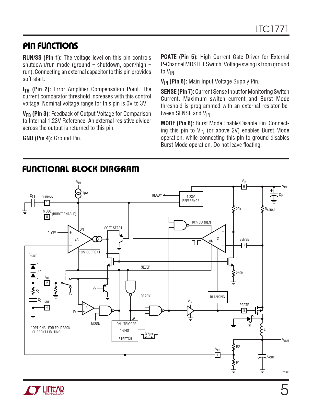 PI FU CTIO S. RUN/SS (Pin 1):. PGATE (Pin 5):. VIN (Pin 6):. ITH (Pin 2):. SENSE (Pin 7):. VFB (Pin 3):. MODE (Pin 8):. GND (Pin 4):