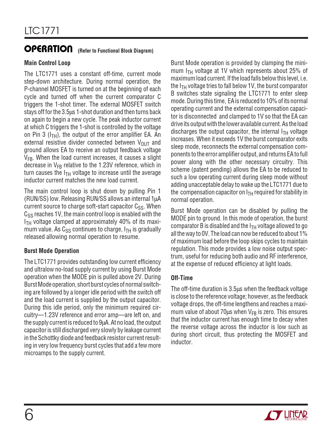 LTC1771 UOPERATIO(Refer to Functional Block Diagram)Main Control Loop Burst Mode operation is provided by clamping the mini- mum I The LTC1771 uses a constant off-time, current mode TH voltage at 1V which represents about 25% of maximum load current. If the load falls below this level, i.e. step-down architecture. During normal operation, the the I P-channel MOSFET is turned on at the beginning of each TH voltage tries to fall below 1V, the burst comparator B switches state signaling the LTC1771 to enter sleep cycle and turned off when the current comparator C mode. During this time, EA is reduced to 10% of its normal triggers the 1-shot timer. The external MOSFET switch operating current and the external compensation capaci- stays off for the 3.5µs 1-shot duration and then turns back tor is disconnected and clamped to 1V so that the EA can on again to begin a new cycle. The peak inductor current drive its output with the lower available current. As the load at which C triggers the 1-shot is controlled by the voltage discharges the output capacitor, the internal I on Pin 3 (I TH voltage TH), the output of the error amplifier EA. An increases. When it exceeds 1V the burst comparator exits external resistive divider connected between VOUT and sleep mode, reconnects the external compensation com- ground allows EA to receive an output feedback voltage ponents to the error amplifier output, and returns EA to full VFB. When the load current increases, it causes a slight power along with the other necessary circuitry. This decrease in VFB relative to the 1.23V reference, which in scheme (patent pending) allows the EA to be reduced to turn causes the ITH voltage to increase until the average such a low operating current during sleep mode without inductor current matches the new load current. adding unacceptable delay to wake up the LTC1771 due to The main control loop is shut down by pulling Pin 1 the compensation capacitor on ITH required for stability in (RUN/SS) low. Releasing RUN/SS allows an internal 1µA normal operation. current source to charge soft-start capacitor CSS. When Burst Mode operation can be disabled by pulling the CSS reaches 1V, the main control loop is enabled with the MODE pin to ground. In this mode of operation, the burst ITH voltage clamped at approximately 40% of its maxi- comparator B is disabled and the I mum value. As C TH voltage allowed to go SS continues to charge, ITH is gradually all the way to 0V. The load can now be reduced to about 1% released allowing normal operation to resume. of maximum load before the loop skips cycles to maintain Burst Mode Operation regulation. This mode provides a low noise output spec- trum, useful for reducing both audio and RF interference, The LTC1771 provides outstanding low current efficiency at the expense of reduced efficiency at light loads. and ultralow no-load supply current by using Burst Mode operation when the MODE pin is pulled above 2V. During Off-Time Burst Mode operation, short burst cycles of normal switch- The off-time duration is 3.5µs when the feedback voltage ing are followed by a longer idle period with the switch off is close to the reference voltage; however, as the feedback and the load current is supplied by the output capacitor. voltage drops, the off-time lengthens and reaches a maxi- During this idle period, only the minimum required cir- mum value of about 70µs when V cuitry—1.23V reference and error amp—are left on, and FB is zero. This ensures that the inductor current has enough time to decay when the supply current is reduced to 9µA. At no load, the output the reverse voltage across the inductor is low such as capacitor is still discharged very slowly by leakage current during short circuit, thus protecting the MOSFET and in the Schottky diode and feedback resistor current result- inductor. ing in very low frequency burst cycles that add a few more microamps to the supply current. 6
