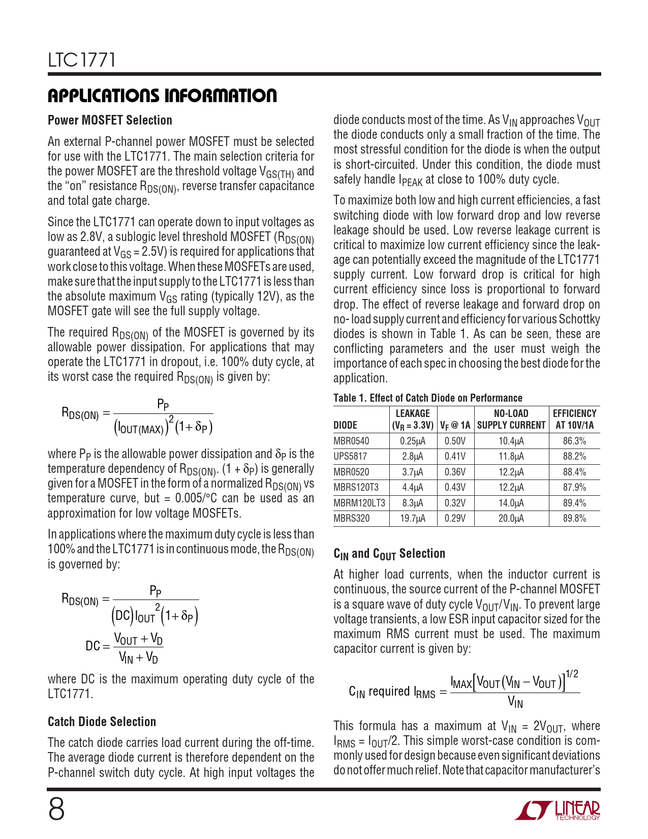 diode conducts most of the time. As VIN approaches VOUT the diode conducts only a small fraction of the time. The An external P-channel power MOSFET must be selected most stressful condition for the diode is when the output for use with the LTC1771. The main selection criteria for is short-circuited. Under this condition, the diode must the power MOSFET are the threshold voltage VGS(TH) and safely handle I the “on” resistance R PEAK at close to 100% duty cycle. DS(ON), reverse transfer capacitance and total gate charge. To maximize both low and high current efficiencies, a fast switching diode with low forward drop and low reverse Since the LTC1771 can operate down to input voltages as leakage should be used. Low reverse leakage current is low as 2.8V, a sublogic level threshold MOSFET (RDS(ON) critical to maximize low current efficiency since the leak- guaranteed at VGS = 2.5V) is required for applications that age can potentially exceed the magnitude of the LTC1771 work close to this voltage. When these MOSFETs are used, supply current. Low forward drop is critical for high make sure that the input supply to the LTC1771 is less than current efficiency since loss is proportional to forward the absolute maximum VGS rating (typically 12V), as the drop. The effect of reverse leakage and forward drop on MOSFET gate will see the full supply voltage. no- load supply current and efficiency for various Schottky The required RDS(ON) of the MOSFET is governed by its diodes is shown in Table 1. As can be seen, these are allowable power dissipation. For applications that may conflicting parameters and the user must weigh the operate the LTC1771 in dropout, i.e. 100% duty cycle, at importance of each spec in choosing the best diode for the its worst case the required RDS(ON) is given by: application.