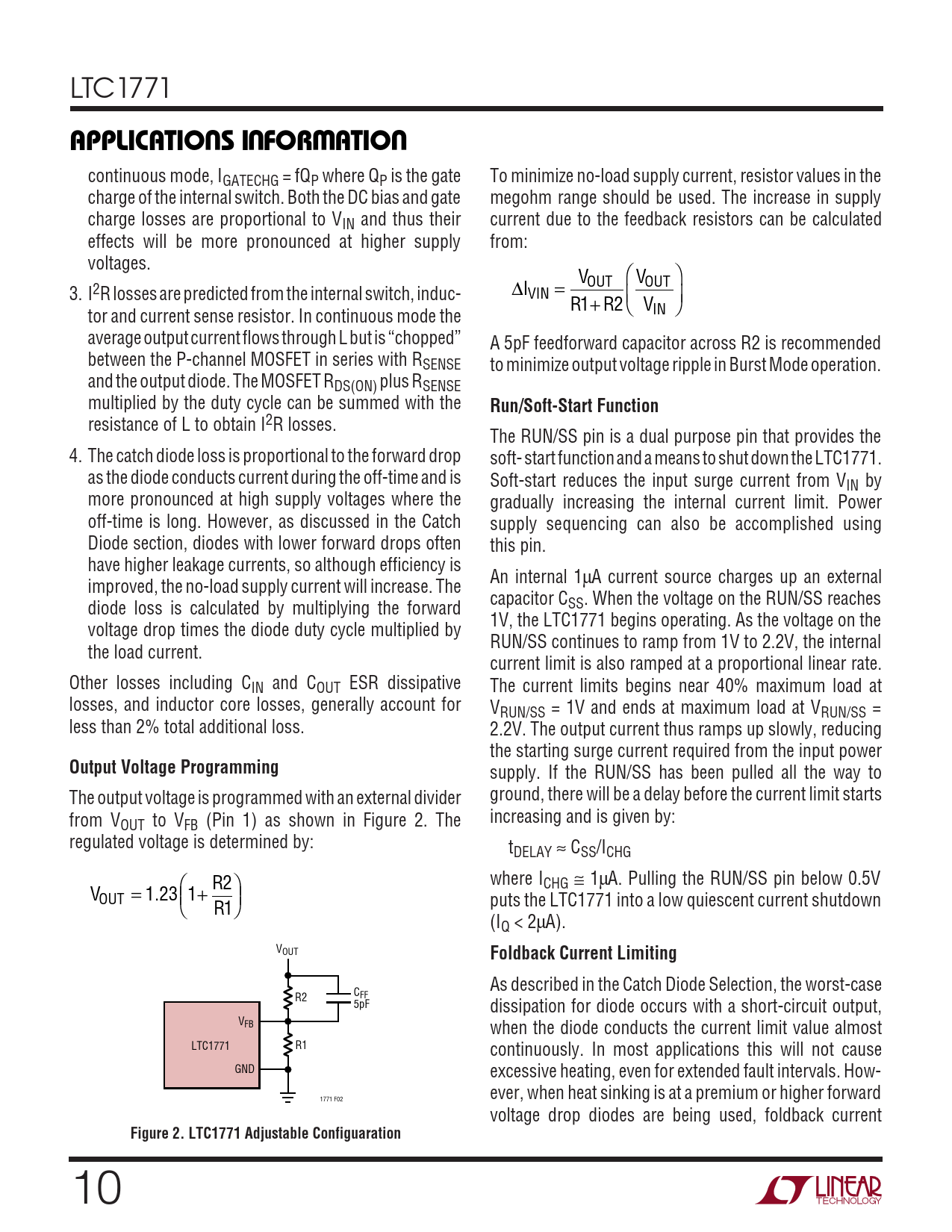 supply. If the RUN/SS has been pulled all the way to The output voltage is programmed with an external divider ground, there will be a delay before the current limit starts from V increasing and is given by: OUT to VFB (Pin 1) as shown in Figure 2. The regulated voltage is determined by: tDELAY ≈ CSS/ICHG  R2 where ICHG ≅ 1µA. Pulling the RUN/SS pin below 0.5V VOUT = 1 2 . 3 1+  R  1 puts the LTC1771 into a low quiescent current shutdown (IQ < 2µA). VOUT