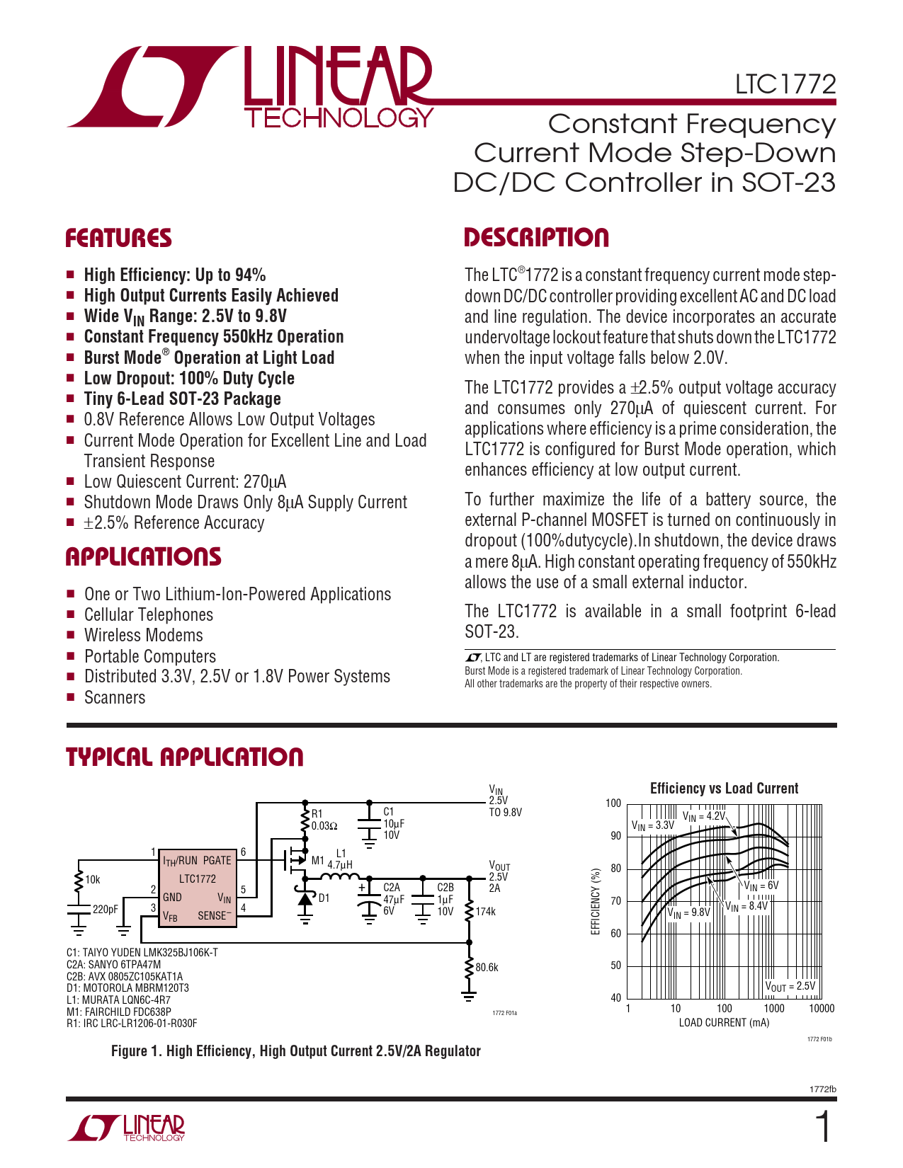 a mere 8µA. High constant operating frequency of 550kHz allows the use of a small external inductor. ■ One or Two Lithium-Ion-Powered Applications ■ The LTC1772 is available in a small footprint 6-lead Cellular Telephones ■ SOT-23. Wireless Modems ■ Portable Computers , LTC and LT are registered trademarks of Linear Technology Corporation. ■ Distributed 3.3V, 2.5V or 1.8V Power Systems Burst Mode is a registered trademark of Linear Technology Corporation. All other trademarks are the property of their respective owners. ■ Scanners