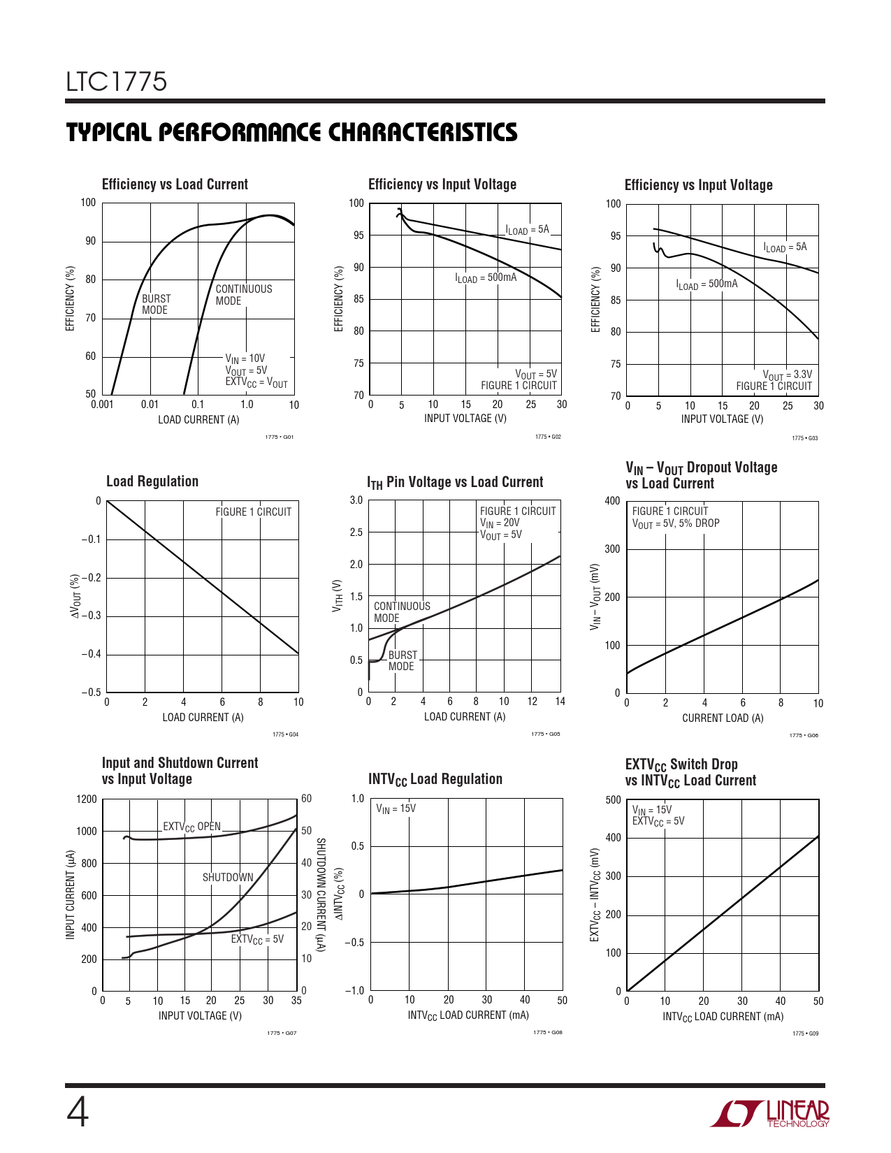 1200 60 1.0 500 VIN = 15V VIN = 15V EXTVCC = 5V EXTV 1000 CC OPEN 50 SHUTDOWN CURRENT ( 400 0.5 µA) 800 40 (mV) SHUTDOWN CC 300 (%) 600 30 CC 0 – INTV ∆INTV CC 200 400 20 INPUT CURRENT ( µ EXTVCC = 5V A) EXTV – 0.5 100 200 10 0 0 –1.0 0 0 5 10 15 20 25 30 35 0 10 20 30 40 50 0 10 20 30 40 50 INPUT VOLTAGE (V) INTVCC LOAD CURRENT (mA) INTVCC LOAD CURRENT (mA) 1775 • G07 1775 • G08 1775 • G09 4