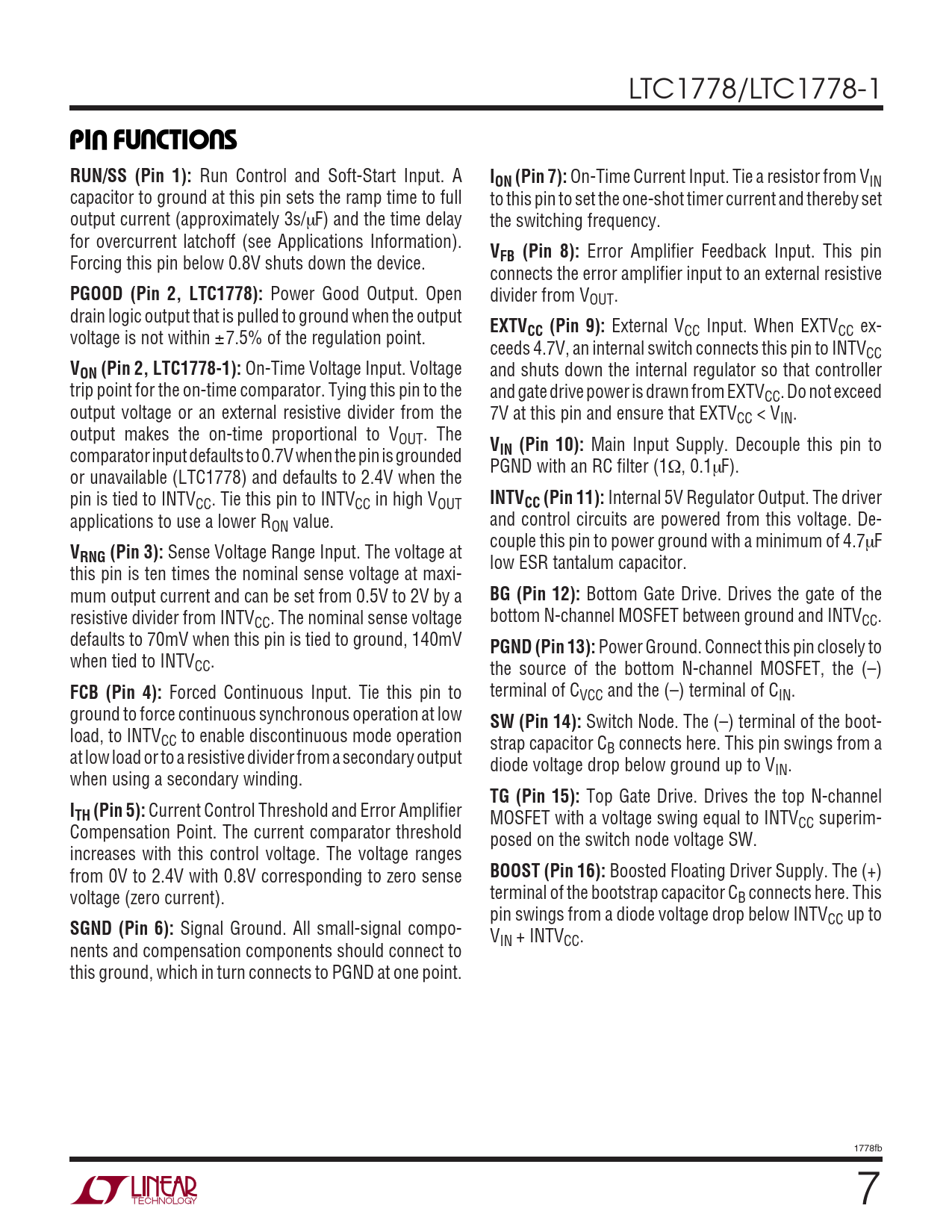 PI FU CTIO S RUN/SS (Pin 1): ION (Pin 7): FB (Pin 8): PGOOD (Pin 2, LTC1778): EXTV CC (Pin 9): VON (Pin 2, LTC1778-1):