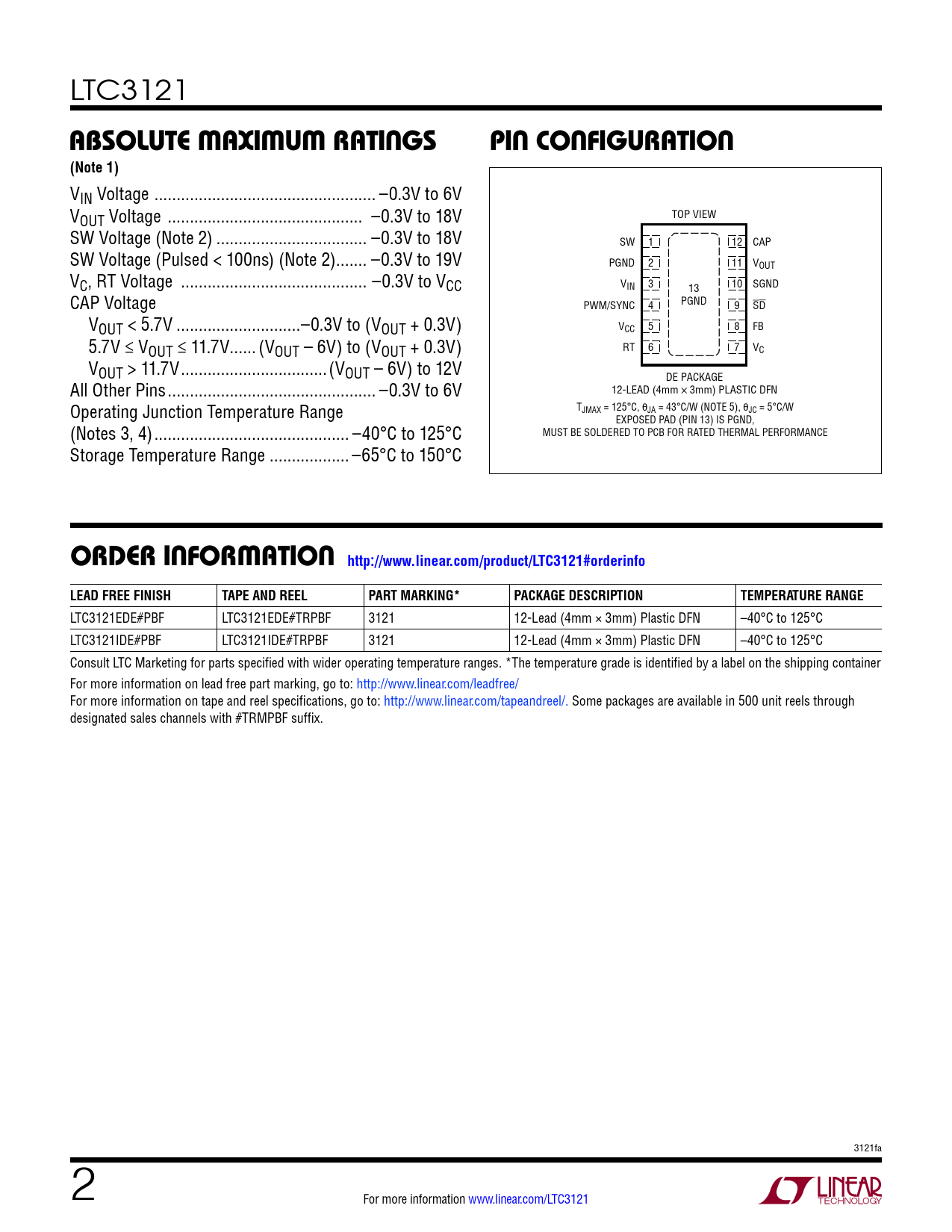 orDer inForMaTion http://www.linear.com/product/LTC3121#orderinfo LEAD FREE FINISH TAPE AND REEL PART MARKING* PACKAGE DESCRIPTION TEMPERATURE RANGE