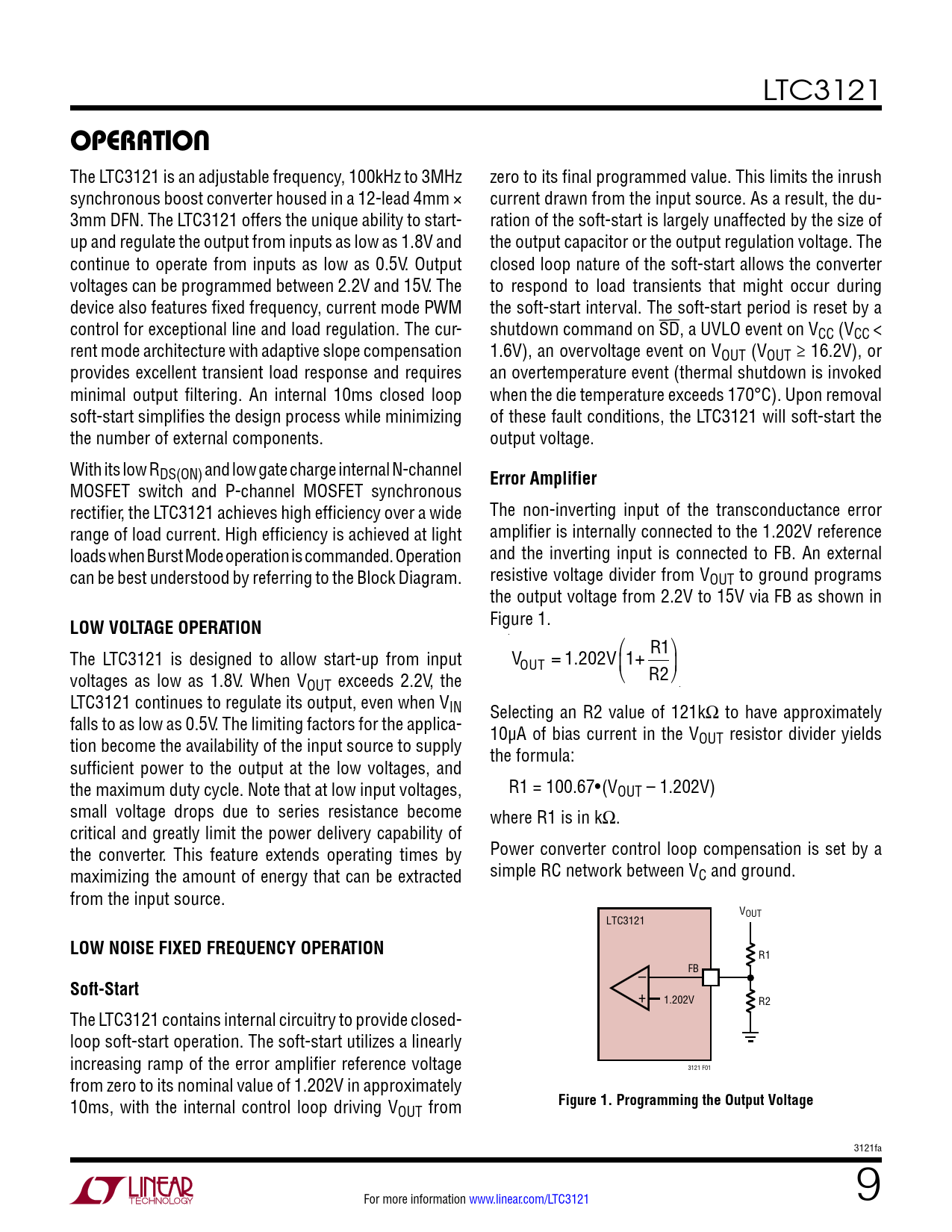 + 1.202V R2 The LTC3121 contains internal circuitry to provide closed- loop soft-start operation. The soft-start utilizes a linearly increasing ramp of the error amplifier reference voltage 3121 F01 from zero to its nominal value of 1.202V in approximately 10ms, with the internal control loop driving V