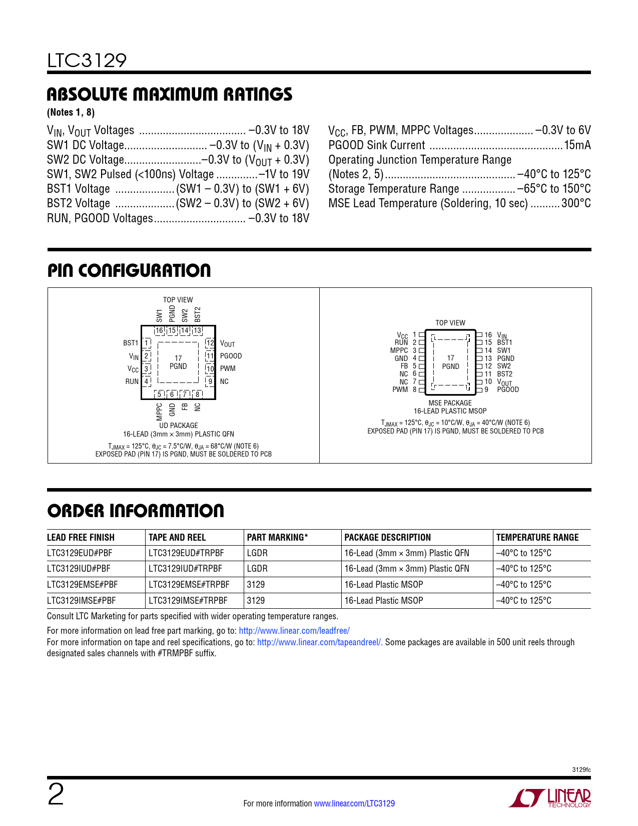 LTC3129 absoluTe MaxiMuM raTings(Notes 1, 8) VIN, VOUT Voltages .. –0.3V to 18V VCC, FB, PWM, MPPC Voltages .. –0.3V to 6V SW1 DC Voltage .. –0.3V to (VIN + 0.3V) PGOOD Sink Current ...15mA SW2 DC Voltage..–0.3V to (VOUT + 0.3V) Operating Junction Temperature Range SW1, SW2 Pulsed (<100ns) Voltage ..–1V to 19V (Notes 2, 5) .. –40°C to 125°C BST1 Voltage ..(SW1 – 0.3V) to (SW1 + 6V) Storage Temperature Range .. –65°C to 150°C BST2 Voltage ..(SW2 – 0.3V) to (SW2 + 6V) MSE Lead Temperature (Soldering, 10 sec) ..300°C RUN, PGOOD Voltages ... –0.3V to 18V pin conFiguraTion TOP VIEW SW1 PGND SW2 BST2 TOP VIEW 16 15 14 13 V 1 CC 16 VIN BST1 1 12 VOUT RUN 2 15 BST1 MPPC 3 14 SW1 VIN 2 11 PGOOD 17 GND 4 17 13 PGND V FB 5 PGND 12 SW2 CC 3 PGND 10 PWM NC 6 11 BST2 RUN 4 9 NC NC 7 10 VOUT PWM 8 9 PGOOD 5 6 7 8 MSE PACKAGE FB NC 16-LEAD PLASTIC MSOP MPPC GND UD PACKAGE TJMAX = 125°C, θJC = 10°C/W, θJA = 40°C/W (NOTE 6) 16-LEAD (3mm × 3mm) PLASTIC QFN EXPOSED PAD (PIN 17) IS PGND, MUST BE SOLDERED TO PCB TJMAX = 125°C, θJC = 7.5°C/W, θJA = 68°C/W (NOTE 6) EXPOSED PAD (PIN 17) IS PGND, MUST BE SOLDERED TO PCB orDer inForMaTion LEAD FREE FINISHTAPE AND REELPART MARKING*PACKAGE DESCRIPTIONTEMPERATURE RANGE LTC3129EUD#PBF LTC3129EUD#TRPBF LGDR 16-Lead (3mm × 3mm) Plastic QFN –40°C to 125°C LTC3129IUD#PBF LTC3129IUD#TRPBF LGDR 16-Lead (3mm × 3mm) Plastic QFN –40°C to 125°C LTC3129EMSE#PBF LTC3129EMSE#TRPBF 3129 16-Lead Plastic MSOP –40°C to 125°C LTC3129IMSE#PBF LTC3129IMSE#TRPBF 3129 16-Lead Plastic MSOP –40°C to 125°C Consult LTC Marketing for parts specified with wider operating temperature ranges. For more information on lead free part marking, go to: http://www.linear.com/leadfree/ For more information on tape and reel specifications, go to: http://www.linear.com/tapeandreel/. Some packages are available in 500 unit reels through designated sales channels with #TRMPBF suffix. 3129fc 2 For more information www.linear.com/LTC3129 Document Outline Features Applications Typical Application Description Absolute Maximum Ratings Pin Configuration Order Information Electrical Characteristics Typical Performance Characteristics Pin Functions Block Diagram Operation Applications Information Typical Applications Package Description Revision History Typical Application Related Parts