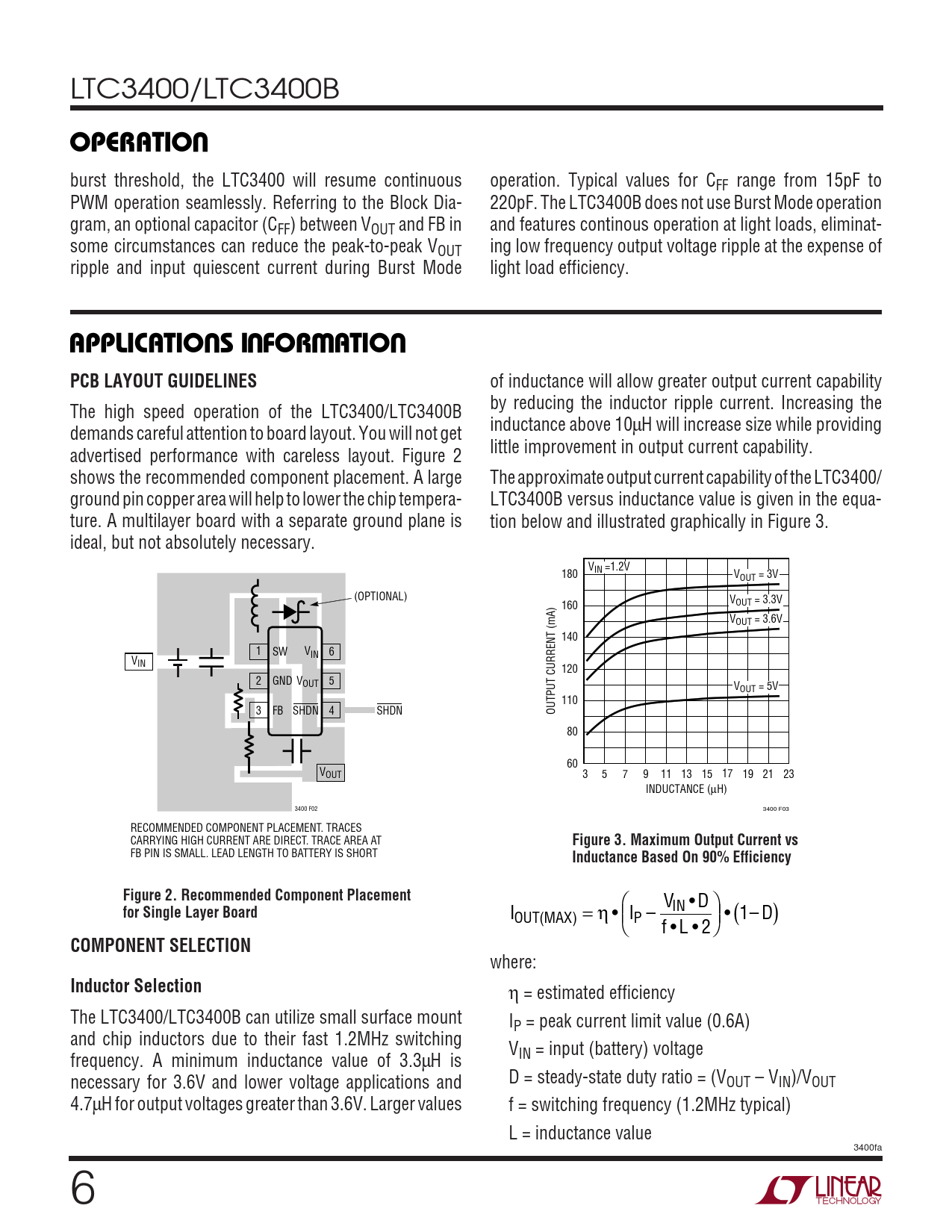 of inductance will allow greater output current capability by reducing the inductor ripple current. Increasing the The high speed operation of the LTC3400/LTC3400B inductance above 10µH will increase size while providing demands careful attention to board layout. You will not get little improvement in output current capability. advertised performance with careless layout. Figure 2 shows the recommended component placement. A large The approximate output current capability of the LTC3400/ ground pin copper area will help to lower the chip tempera- LTC3400B versus inductance value is given in the equa- ture. A multilayer board with a separate ground plane is tion below and illustrated graphically in Figure 3. ideal, but not absolutely necessary. V 180 IN =1.2V VOUT = 3V (OPTIONAL) V 160 OUT = 3.3V VOUT = 3.6V 140 1 SW V 6 IN VIN 120 2 GND V 5 OUT VOUT = 5V 110 3 FB SHDN 4 SHDN OUTPUT CURRENT (mA) 80 60 VOUT 3 5 7 9 11 13 15 17 19 21 23 INDUCTANCE (µH) 3400 F02 3400 F03 RECOMMENDED COMPONENT PLACEMENT. TRACES CARRYING HIGH CURRENT ARE DIRECT. TRACE AREA AT