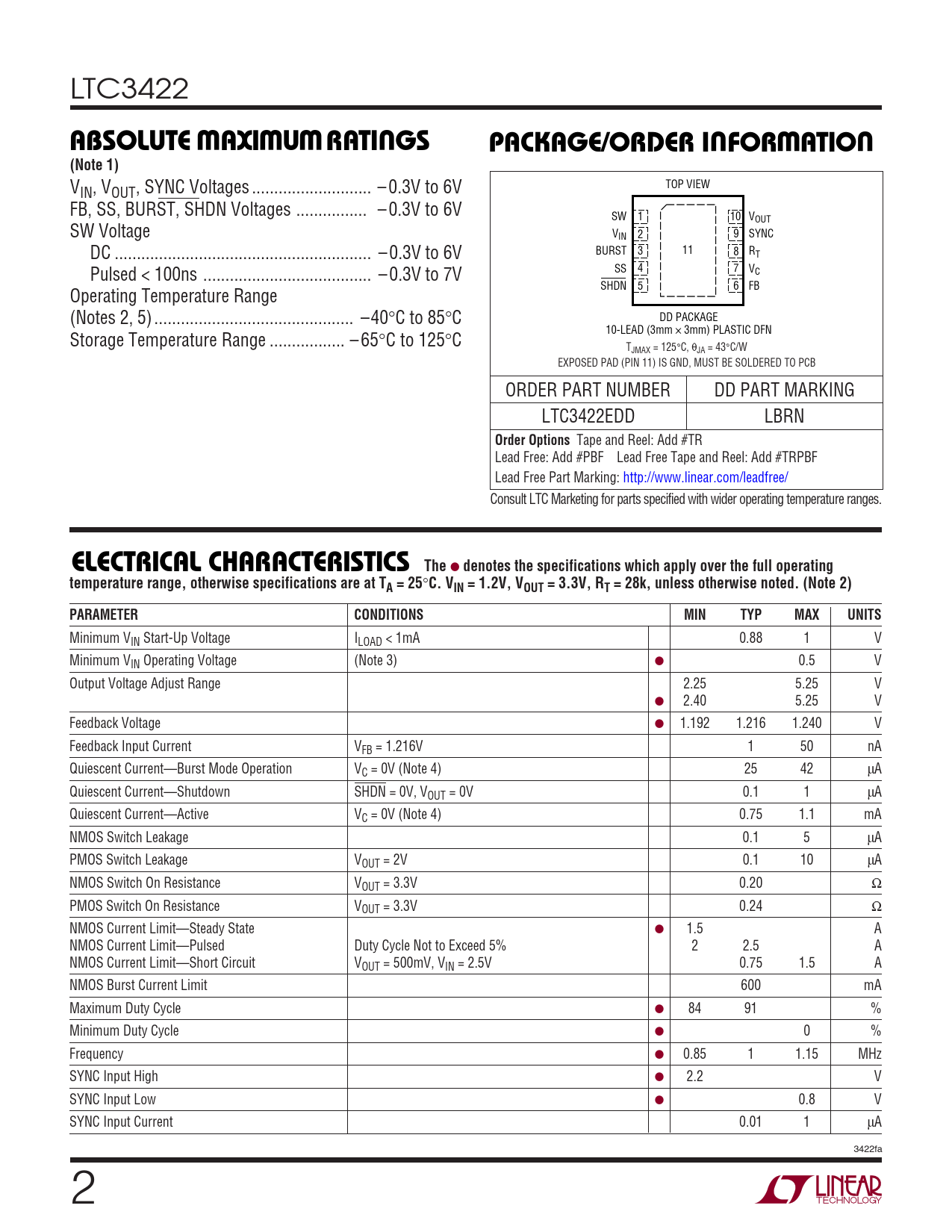 V TOP VIEW IN, VOUT, SYNC Voltages ... – 0.3V to 6V FB, SS, BURST, SHDN Voltages .. – 0.3V to 6V SW 1 10 VOUT SW Voltage V 2 9 SYNC IN DC .. – 0.3V to 6V BURST 3 11 8 RT Pulsed < 100ns .. – 0.3V to 7V SS 4 7 VC SHDN 5 6 FB Operating Temperature Range (Notes 2, 5) ... –40°C to 85°C DD PACKAGE 10-LEAD (3mm × 3mm) PLASTIC DFN Storage Temperature Range ... – 65°C to 125°C TJMAX = 125°C, θJA = 43°C/W EXPOSED PAD (PIN 11) IS GND, MUST BE SOLDERED TO PCB ORDER PART NUMBER DD PART MARKING LTC3422EDD LBRN