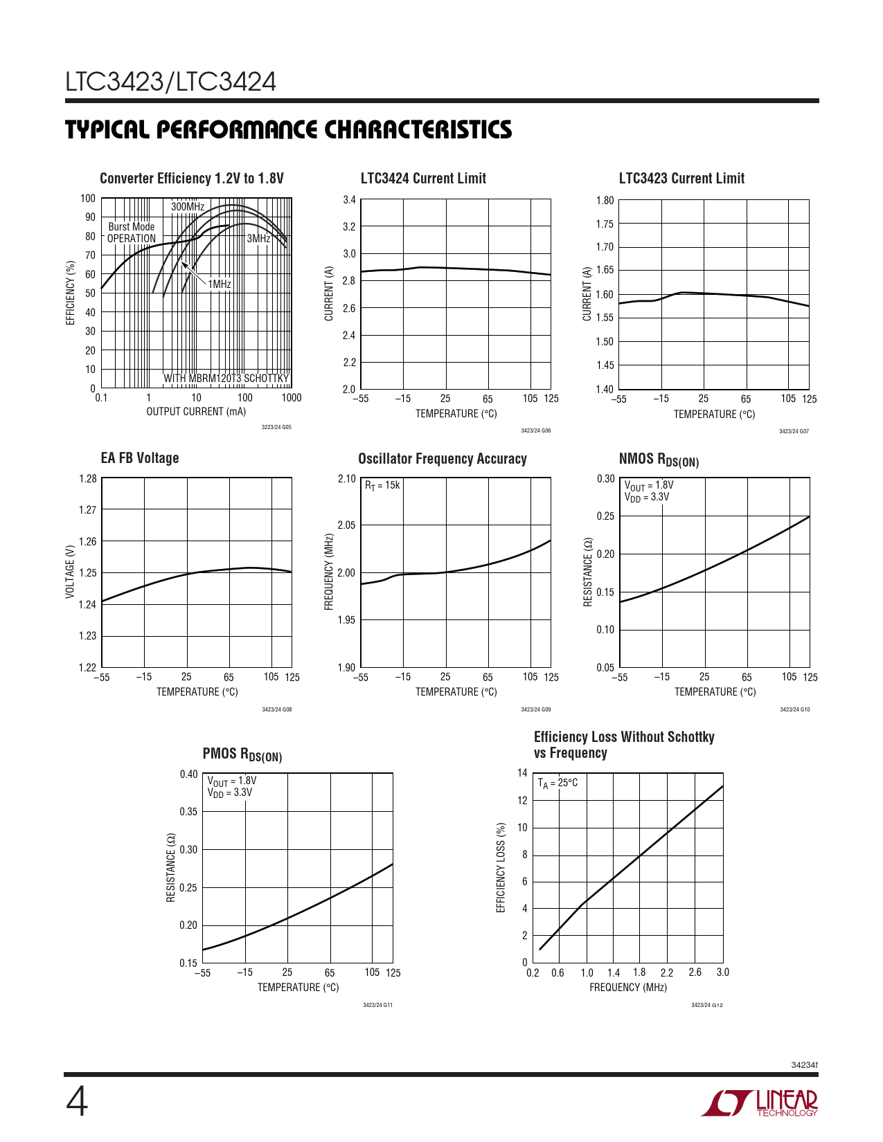 0.40 14 VOUT = 1.8V TA = 25°C VDD = 3.3V 12 0.35 10 ) Ω 0.30 8 6 0.25 RESISTANCE ( EFFICIENCY LOSS (%) 4 0.20 2 0.15 0 –55 –15 25 65 105 125 0.2 0.6 1.0 1.4 1.8 2.2 2.6 3.0 TEMPERATURE (°C) FREQUENCY (MHz) 3423/24 G11 3423/24 G12 34234f 4