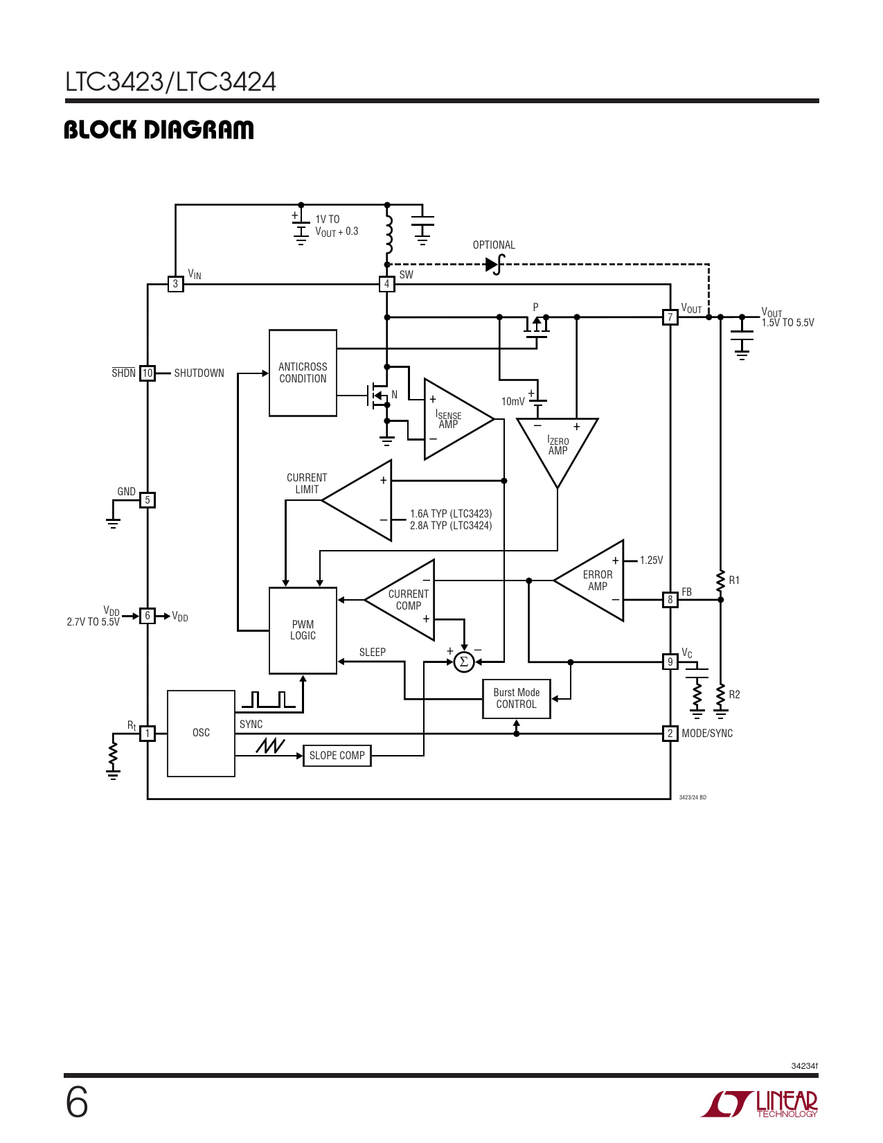 + 1V TO VOUT + 0.3 OPTIONAL VIN SW 3 4 P VOUT VOUT 7 1.5V TO 5.5V ANTICROSS SHDN 10 SHUTDOWN CONDITION N + + 10mV ISENSE AMP – + – IZERO AMP + CURRENT LIMIT GND 5 – 1.6A TYP (LTC3423) 2.8A TYP (LTC3424) + 1.25V – ERROR R1 AMP CURRENT – FB 8 COMP VDD + 6 VDD 2.7V TO 5.5V PWM LOGIC SLEEP + – Σ VC 9 Burst Mode R2 CONTROL R SYNC t 1 OSC 2 MODE/SYNC SLOPE COMP 3423/24 BD 34234f 6