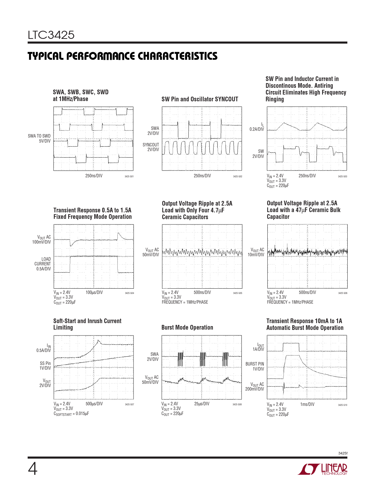 I I IN OUT 0.5A/DIV 1A/DIV SWA 2V/DIV SS Pin BURST PIN 1V/DIV 1V/DIV VOUT AC VOUT 50mV/DIV 2V/DIV VOUT AC 200mV/DIV VIN = 2.4V 500µs/DIV 3425 G07 VIN = 2.4V 25µs/DIV 3425 G08 VIN = 2.4V 1ms/DIV 3425 G10 VOUT = 3.3V VOUT = 3.3V VOUT = 3.3V CSOFTSTART = 0.015µF COUT = 220µF COUT = 220µF 3425f 4