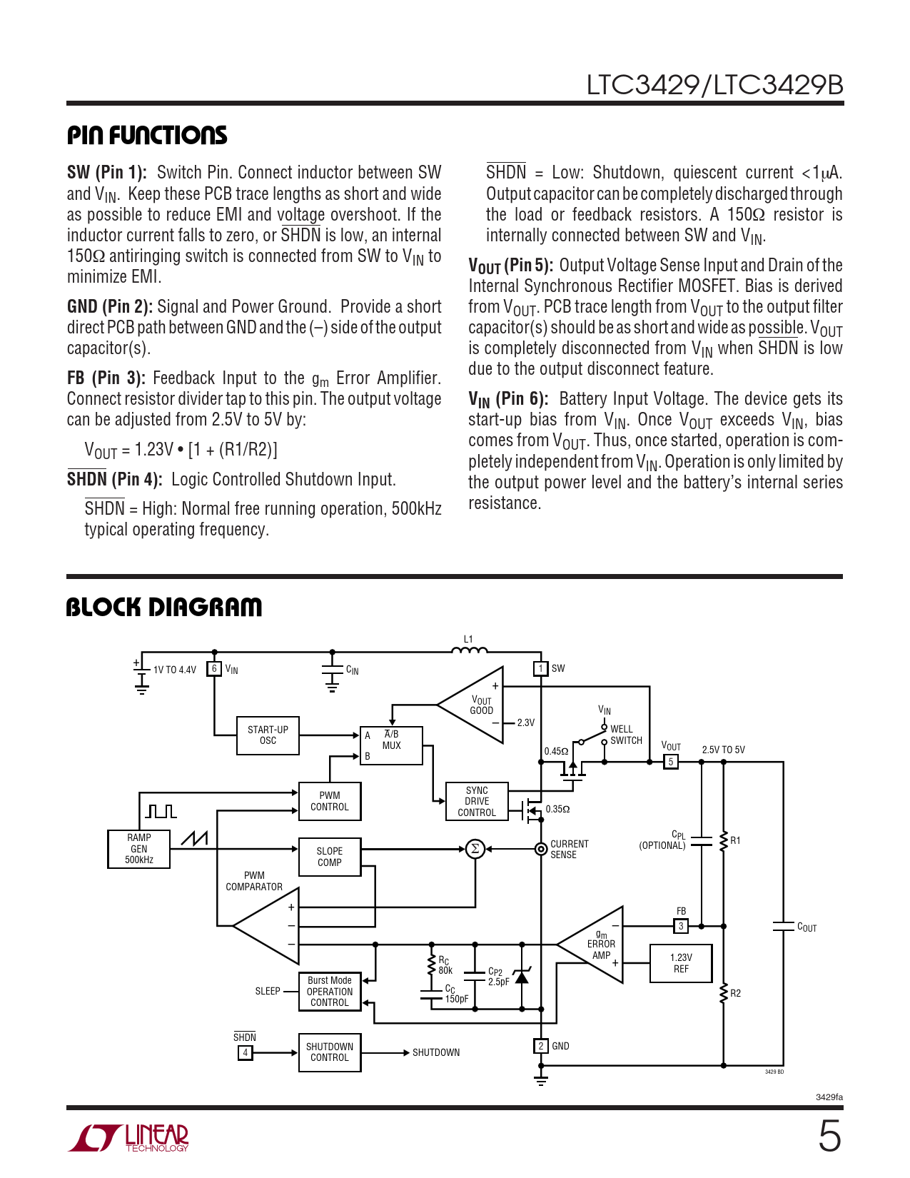 L1 + 1V TO 4.4V 6 VIN C 1 SW IN + VOUT GOOD VIN – 2.3V START-UP WELL A A/B OSC SWITCH MUX VOUT 0.45 2.5V TO 5V B Ω 5 SYNC PWM DRIVE CONTROL CONTROL 0.35Ω RAMP CPL R1 CURRENT GEN (OPTIONAL) SLOPE Σ SENSE 500kHz COMP PWM COMPARATOR + FB – – 3 COUT g – m ERROR AMP + 1.23V RC REF 80k CP2 Burst Mode 2.5pF SLEEP OPERATION CC R2 CONTROL 150pF SHDN SHUTDOWN 2 GND 4 SHUTDOWN CONTROL 3429 BD 3429fa 5