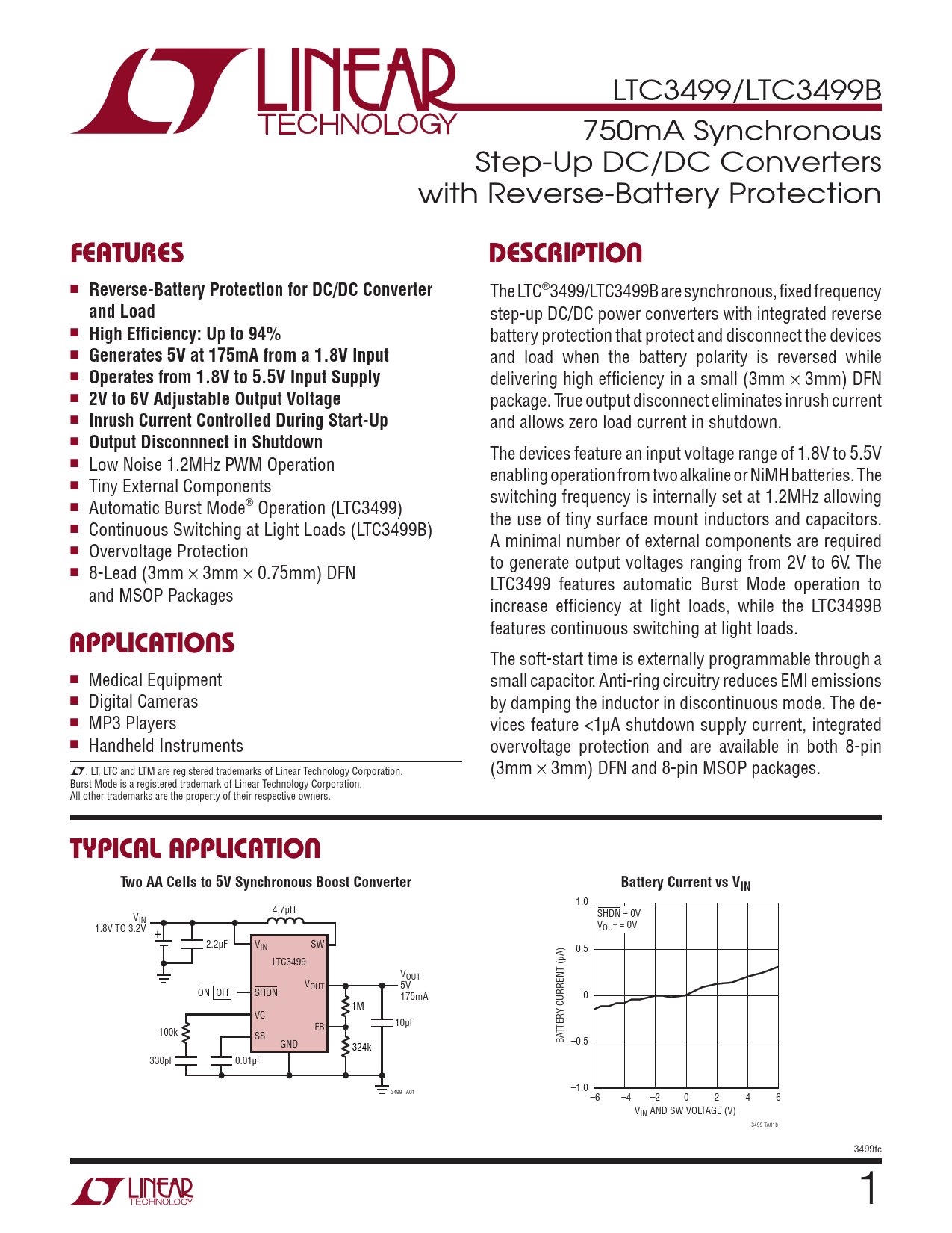 LTC3499/LTC3499B 750mA Synchronous Step-Up DC/DC Converters with Reverse-Battery Protection FEATURESDESCRIPTION n Reverse-Battery Protection for DC/DC Converter The LTC®3499/LTC3499B are synchronous, fixed frequency and Load step-up DC/DC power converters with integrated reverse n High Efficiency: Up to 94% battery protection that protect and disconnect the devices n Generates 5V at 175mA from a 1.8V Input and load when the battery polarity is reversed while n Operates from 1.8V to 5.5V Input Supply delivering high efficiency in a small (3mm × 3mm) DFN n 2V to 6V Adjustable Output Voltage package. True output disconnect eliminates inrush current n Inrush Current Controlled During Start-Up and allows zero load current in shutdown. n Output Disconnnect in Shutdown The devices feature an input voltage range of 1.8V to 5.5V n Low Noise 1.2MHz PWM Operation enabling operation from two alkaline or NiMH batteries. The n Tiny External Components switching frequency is internally set at 1.2MHz allowing n Automatic Burst Mode® Operation (LTC3499) the use of tiny surface mount inductors and capacitors. n Continuous Switching at Light Loads (LTC3499B) A minimal number of external components are required n Overvoltage Protection to generate output voltages ranging from 2V to 6V. The n 8-Lead (3mm × 3mm × 0.75mm) DFN LTC3499 features automatic Burst Mode operation to and MSOP Packages increase efficiency at light loads, while the LTC3499B features continuous switching at light loads. APPLICATIONS The soft-start time is externally programmable through a n Medical Equipment small capacitor. Anti-ring circuitry reduces EMI emissions n Digital Cameras by damping the inductor in discontinuous mode. The de- n MP3 Players vices feature <1µA shutdown supply current, integrated n Handheld Instruments overvoltage protection and are available in both 8-pin L, LT, LTC and LTM are registered trademarks of Linear Technology Corporation. (3mm × 3mm) DFN and 8-pin MSOP packages. Burst Mode is a registered trademark of Linear Technology Corporation. All other trademarks are the property of their respective owners. TYPICAL APPLICATIONTwo AA Cells to 5V Synchronous Boost ConverterBattery Current vs VIN 1.0 4.7µH V SHDN = 0V IN 1.8V TO 3.2V + VOUT = 0V 2.2µF VIN SW 0.5 LTC3499 VOUT VOUT 5V ON OFF SHDN 175mA 0 1M VC Y CURRENT (µA) FB 10µF 100k TTER SS GND BA 324k –0.5 330pF 0.01µF –1.0 3499 TA01 –6 –4 –2 0 2 4 6 VIN AND SW VOLTAGE (V) 3499 TA01b 3499fc 1