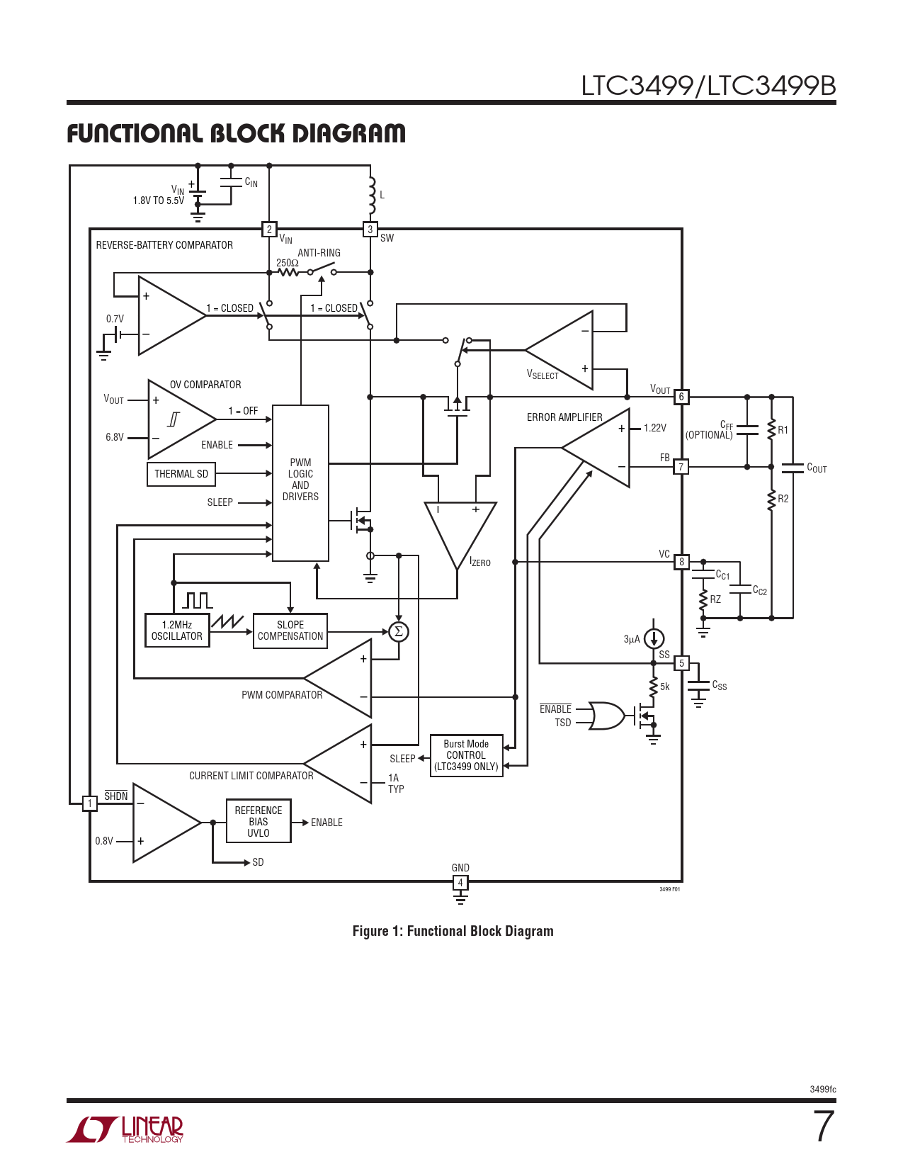 C + IN VIN L 1.8V TO 5.5V 2 3 VIN SW REVERSE-BATTERY COMPARATOR ANTI-RING 250Ω + 1 = CLOSED 1 = CLOSED 0.7V – – – + + VSELECT OV COMPARATOR VOUT VOUT + 6 1 = OFF ERROR AMPLIFIER C 1.22V FF + 6.8V – (OPTIONAL) R1 ENABLE FB PWM – 7 COUT THERMAL SD LOGIC AND DRIVERS SLEEP – + R2 VC IZERO 8 CC1 CC2 RZ 1.2MHz SLOPE OSCILLATOR COMPENSATION Σ 3µA SS + 5 5k CSS PWM COMPARATOR – ENABLE TSD + Burst Mode SLEEP CONTROL (LTC3499 ONLY) CURRENT LIMIT COMPARATOR – 1A TYP SHDN – 1 REFERENCE BIAS ENABLE + UVLO 0.8V SD GND 4 3499 F01