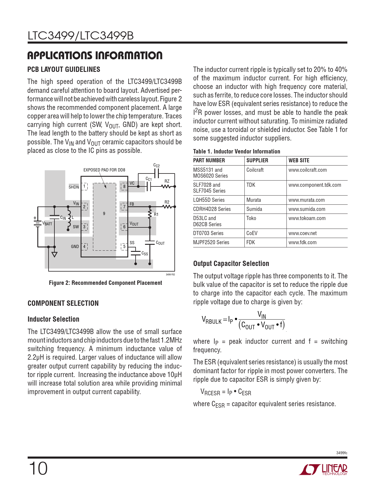 The inductor current ripple is typically set to 20% to 40% The high speed operation of the LTC3499/LTC3499B of the maximum inductor current. For high efficiency, demand careful attention to board layout. Advertised per- choose an inductor with high frequency core material, formance will not be achieved with careless layout. Figure 2 such as ferrite, to reduce core losses. The inductor should shows the recommended component placement. A large have low ESR (equivalent series resistance) to reduce the copper area will help to lower the chip temperature. Traces I2R power losses, and must be able to handle the peak carrying high current (SW, V inductor current without saturating. To minimize radiated OUT, GND) are kept short. The lead length to the battery should be kept as short as noise, use a toroidal or shielded inductor. See Table 1 for possible. The V some suggested inductor suppliers. IN and VOUT ceramic capacitors should be placed as close to the IC pins as possible.