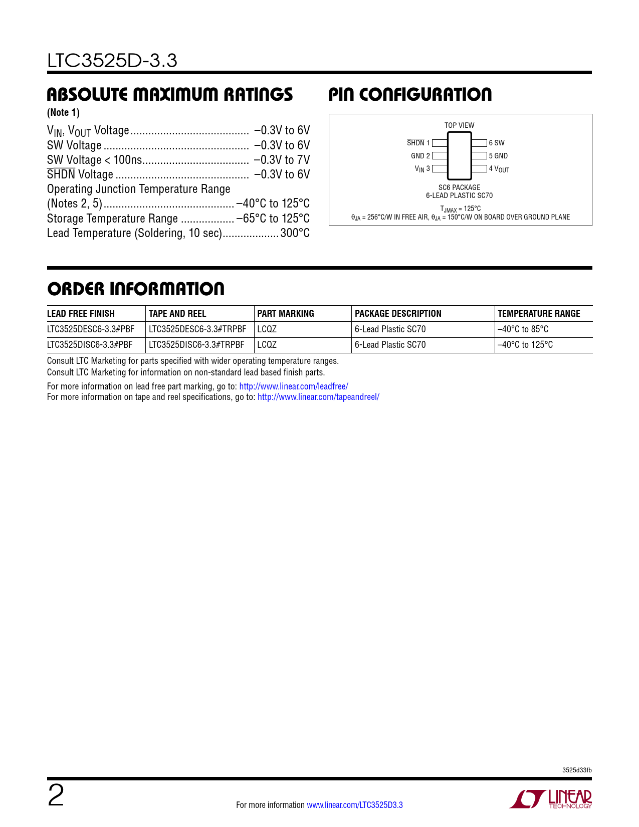 LTC3525DESC6-3.3#PBF LTC3525DESC6-3.3#TRPBF LCQZ 6-Lead Plastic SC70 –40°C to 85°C LTC3525DISC6-3.3#PBF LTC3525DISC6-3.3#TRPBF LCQZ 6-Lead Plastic SC70 –40°C to 125°C Consult LTC Marketing for parts specified with wider operating temperature ranges. Consult LTC Marketing for information on non-standard lead based finish parts. For more information on lead free part marking, go to: http://www.linear.com/leadfree/ For more information on tape and reel specifications, go to: http://www.linear.com/tapeandreel/ 3525d33fb 2 For more information www.linear.com/LTC3525D3.3 Document Outline Features Applications Description Typical Application Absolute Maximum Ratings Pin Configuration Order Information Electrical Characteristics Typical Performance Characteristics Pin Functions Block Diagram Operation Typical Applications Package Description Revision History Related Parts