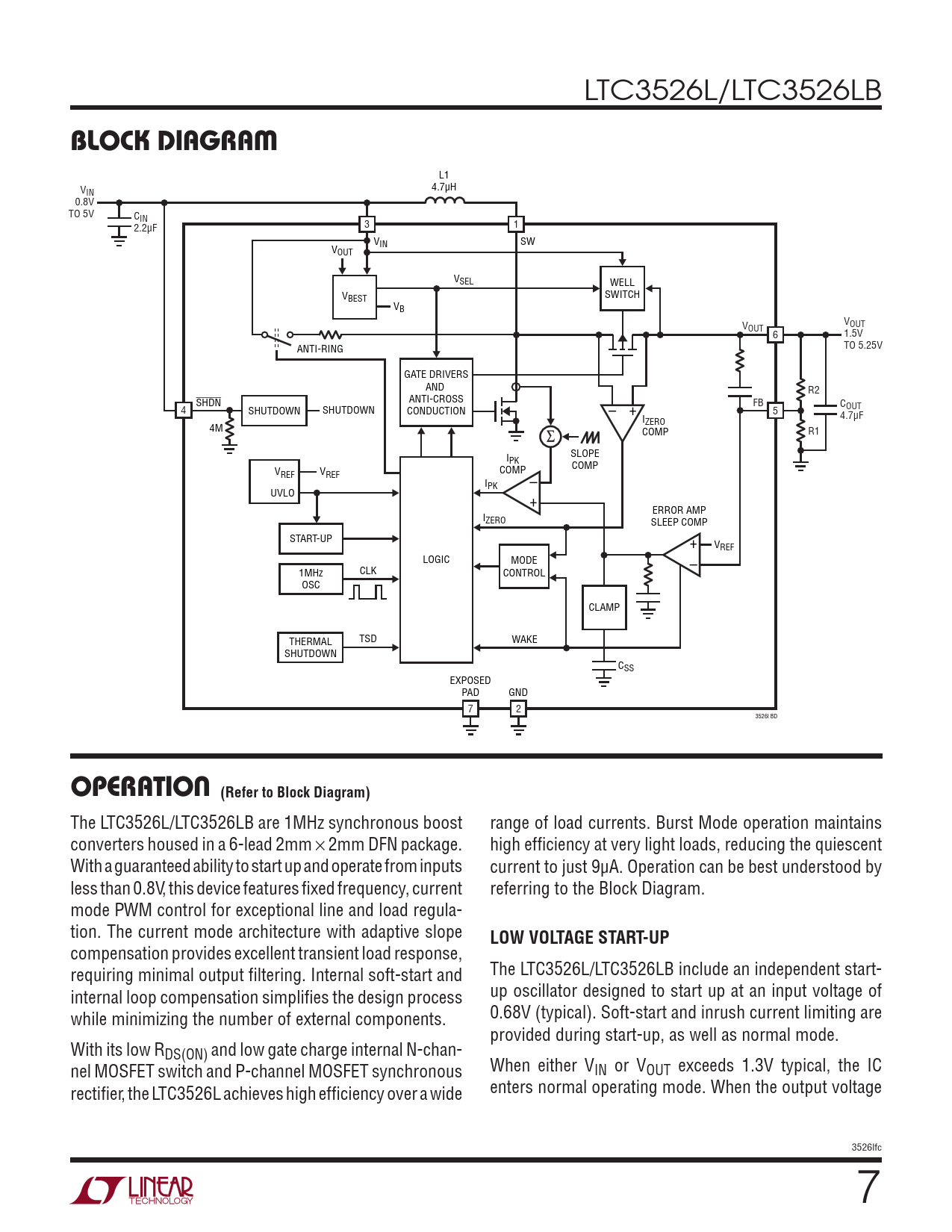 LTC3526L/LTC3526LB block DiAgrAM L1 V 4.7µH IN 0.8V TO 5V CIN 3 1 2.2µF VIN SW VOUT VSEL WELL V SWITCH BEST VB V V OUT OUT 6 1.5V ANTI-RING TO 5.25V GATE DRIVERS AND R2 ANTI-CROSS SHDN FB C 4 SHUTDOWN SHUTDOWN CONDUCTION – + 5 OUT I 4.7µF ZERO 4M COMP R1 I SLOPE PK V COMP REF VREF – COMP IPK UVLO + ERROR AMP IZERO SLEEP COMP START-UP + VREF LOGIC MODE – 1MHz CLK CONTROL OSC CLAMP THERMAL TSD WAKE SHUTDOWN CSS EXPOSED PAD GND 7 2 3526l BD operAtion