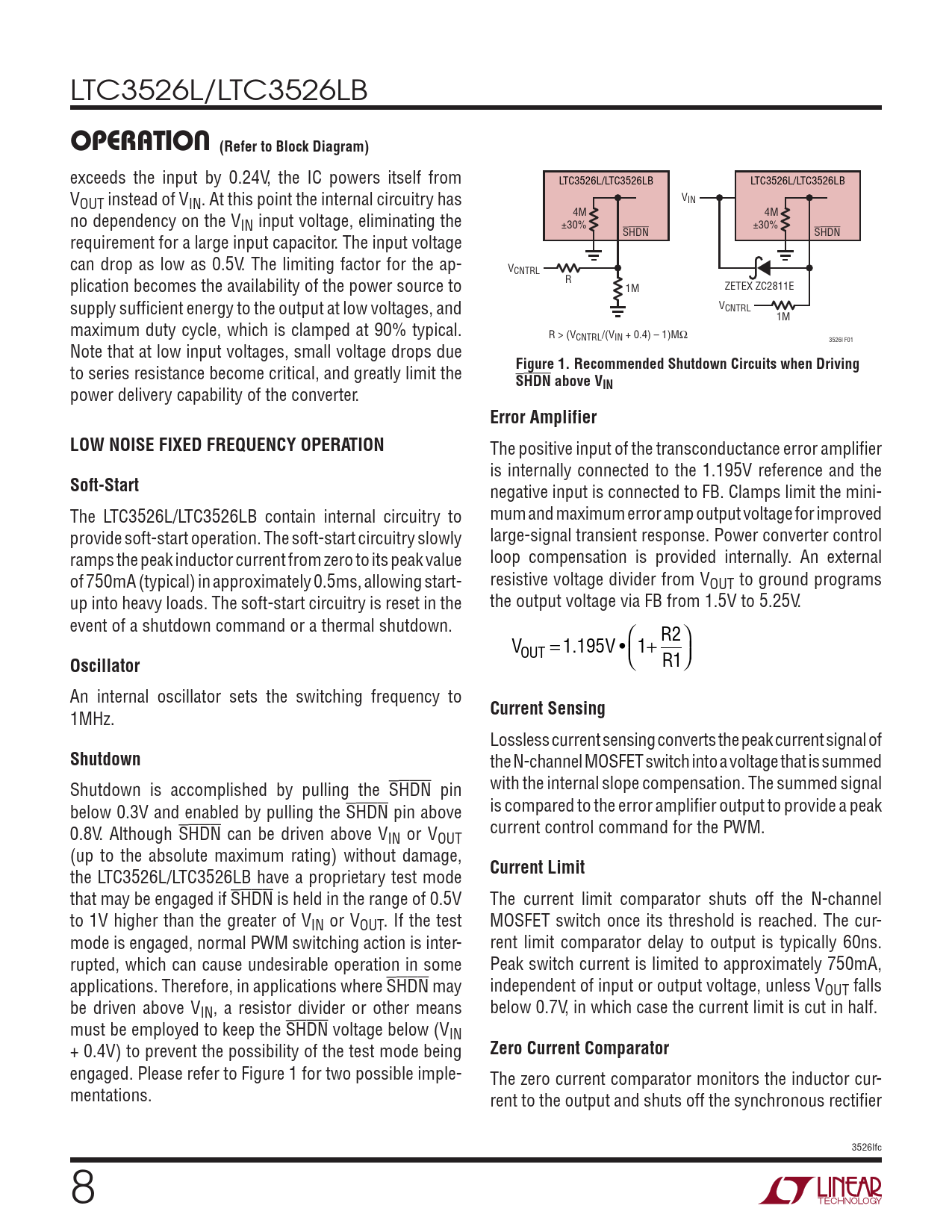 the N-channel MOSFET switch into a voltage that is summed Shutdown is accomplished by pul ing the SHDN pin with the internal slope compensation. The summed signal below 0.3V and enabled by pulling the SHDN pin above is compared to the error amplifier output to provide a peak 0.8V. Although SHDN can be driven above V current control command for the PWM. IN or VOUT (up to the absolute maximum rating) without damage, the LTC3526L/LTC3526LB have a proprietary test mode