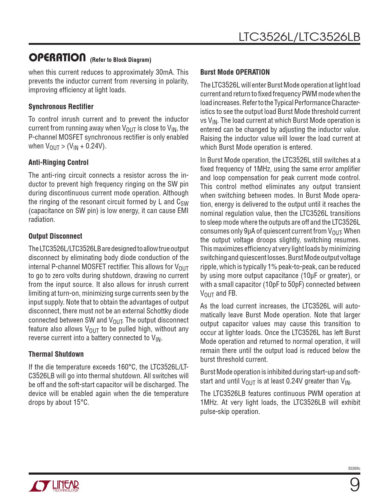 LTC3526L/LTC3526LB operAtion (Refer to Block Diagram) when this current reduces to approximately 30mA. This Burst Mode OPERATION prevents the inductor current from reversing in polarity, The LTC3526L will enter Burst Mode operation at light load improving efficiency at light loads. current and return to fixed frequency PWM mode when the Synchronous Rectifier load increases. Refer to the Typical Performance Character- istics to see the output load Burst Mode threshold current To control inrush current and to prevent the inductor vs VIN. The load current at which Burst Mode operation is current from running away when VOUT is close to VIN, the entered can be changed by adjusting the inductor value. P-channel MOSFET synchronous rectifier is only enabled Raising the inductor value will lower the load current at when VOUT > (VIN + 0.24V). which Burst Mode operation is entered. Anti-Ringing Control In Burst Mode operation, the LTC3526L still switches at a fixed frequency of 1MHz, using the same error amplifier The anti-ring circuit connects a resistor across the in- and loop compensation for peak current mode control. ductor to prevent high frequency ringing on the SW pin This control method eliminates any output transient during discontinuous current mode operation. Although when switching between modes. In Burst Mode opera- the ringing of the resonant circuit formed by L and CSW tion, energy is delivered to the output until it reaches the (capacitance on SW pin) is low energy, it can cause EMI nominal regulation value, then the LTC3526L transitions radiation. to sleep mode where the outputs are off and the LTC3526L consumes only 9µA of quiescent current from V Output Disconnect OUT. When the output voltage droops slightly, switching resumes. The LTC3526L/LTC3526LB are designed to al ow true output This maximizes efficiency at very light loads by minimizing disconnect by eliminating body diode conduction of the switching and quiescent losses. Burst Mode output voltage internal P-channel MOSFET rectifier. This allows for VOUT ripple, which is typically 1% peak-to-peak, can be reduced to go to zero volts during shutdown, drawing no current by using more output capacitance (10µF or greater), or from the input source. It also allows for inrush current with a small capacitor (10pF to 50pF) connected between limiting at turn-on, minimizing surge currents seen by the VOUT and FB. input supply. Note that to obtain the advantages of output As the load current increases, the LTC3526L will auto- disconnect, there must not be an external Schottky diode matically leave Burst Mode operation. Note that larger connected between SW and VOUT. The output disconnect output capacitor values may cause this transition to feature also allows VOUT to be pulled high, without any occur at lighter loads. Once the LTC3526L has left Burst reverse current into a battery connected to VIN. Mode operation and returned to normal operation, it will Thermal Shutdown remain there until the output load is reduced below the burst threshold current. If the die temperature exceeds 160°C, the LTC3526L/LT- C3526LB will go into thermal shutdown. All switches will Burst Mode operation is inhibited during start-up and soft- be off and the soft-start capacitor will be discharged. The start and until VOUT is at least 0.24V greater than VIN. device will be enabled again when the die temperature The LTC3526LB features continuous PWM operation at drops by about 15°C. 1MHz. At very light loads, the LTC3526LB will exhibit pulse-skip operation. 3526lfc Document Outline Features Applications Description Typical Application Absolute Maximum Ratings Pin Configuration Order Information Electrical Characteristics Typical Performance Characteristics Pin Functions Block Diagram Operation Applications Information Typical Applications Package Description Revision History Typical Application Related Parts