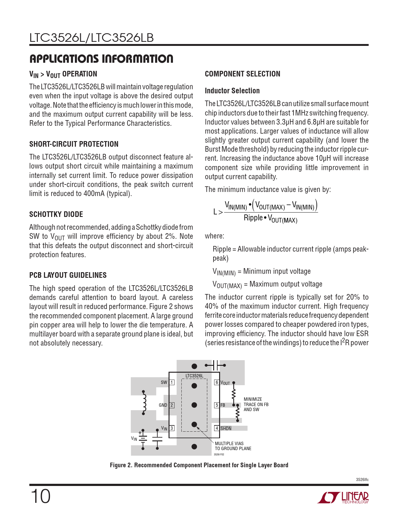 even when the input voltage is above the desired output voltage. Note that the efficiency is much lower in this mode, The LTC3526L/LTC3526LB can utilize small surface mount and the maximum output current capability will be less. chip inductors due to their fast 1MHz switching frequency. Refer to the Typical Performance Characteristics. Inductor values between 3.3µH and 6.8µH are suitable for most applications. Larger values of inductance will allow