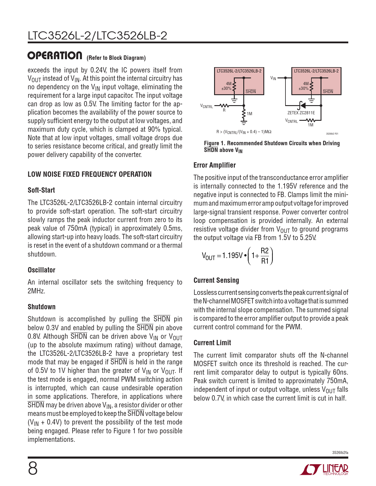 is internally connected to the 1.195V reference and the negative input is connected to FB. Clamps limit the mini- The LTC3526L-2/LTC3526LB-2 contain internal circuitry mum and maximum error amp output voltage for improved to provide soft-start operation. The soft-start circuitry large-signal transient response. Power converter control slowly ramps the peak inductor current from zero to its loop compensation is provided internally. An external peak value of 750mA (typical) in approximately 0.5ms, resistive voltage divider from VOUT to ground programs allowing start-up into heavy loads. The soft-start circuitry the output voltage via FB from 1.5V to 5.25V. is reset in the event of a shutdown command or a thermal shutdown.  R2 V 1. V  OUT = 195 • + 1  R1