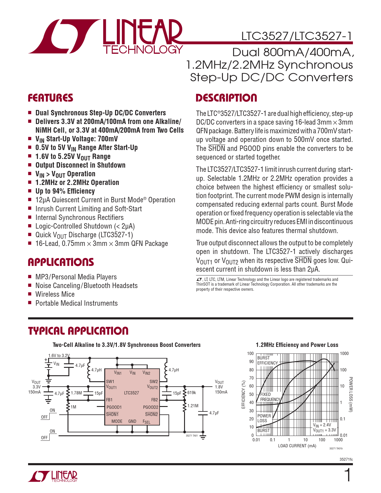 LTC3527/LTC3527-1 Dual 800mA/400mA, 1.2MHz/2.2MHz Synchronous Step-Up DC/DC Converters FEATURESDESCRIPTION n Dual Synchronous Step-Up DC/DC Converters The LTC®3527/LTC3527-1 are dual high effi ciency, step-up n Delivers 3.3V at 200mA/100mA from one Alkaline/ DC/DC converters in a space saving 16-lead 3mm × 3mm NiMH Cell, or 3.3V at 400mA/200mA from Two Cells QFN package. Battery life is maximized with a 700mV start- n VIN Start-Up Voltage: 700mV up voltage and operation down to 500mV once started. n 0.5V to 5V VIN Range After Start-Up The SHDN and PGOOD pins enable the converters to be n 1.6V to 5.25V VOUT Range sequenced or started together. n Output Disconnect in Shutdown The LTC3527/LTC3527-1 limit inrush current during start- n VIN > VOUT Operation up. Selectable 1.2MHz or 2.2MHz operation provides a n 1.2MHz or 2.2MHz Operation choice between the highest effi ciency or smallest solu- n Up to 94% Effi ciency tion footprint. The current mode PWM design is internally n 12μA Quiescent Current in Burst Mode® Operation compensated reducing external parts count. Burst Mode n Inrush Current Limiting and Soft-Start operation or fi xed frequency operation is selectable via the n Internal Synchronous Rectifi ers MODE pin. Anti-ring circuitry reduces EMI in discontinuous n Logic-Controlled Shutdown (< 2μA) mode. This device also features thermal shutdown. n Quick VOUT Discharge (LTC3527-1) n 16-Lead, 0.75mm × 3mm × 3mm QFN Package True output disconnect allows the output to be completely open in shutdown. The LTC3527-1 actively discharges APPLICATIONS VOUT1 or VOUT2 when its respective SHDN goes low. Qui- escent current in shutdown is less than 2μA. n MP3/Personal Media Players L, LT, LTC, LTM, Linear Technology and the Linear logo are registered trademarks and n Noise Canceling/Bluetooth Headsets ThinSOT is a trademark of Linear Technology Corporation. All other trademarks are the property of their respective owners. n Wireless Mice n Portable Medical Instruments TYPICAL APPLICATIONTwo-Cell Alkaline to 3.3V/1.8V Synchronous Boost Converters1.2MHz Effi ciency and Power Loss 100 1000 1.6V to 3.2V BURST + 90 V EFFICIENCY IN 4.7μF 4.7μH 4.7μH 80 100 VIN1 VIN VIN2 POWER LOSS (mW) 70 VOUT SW1 SW2 VOUT 3.3V V 60 10 OUT1 VOUT2 1.8V 150mA 4.7μF 1.78M 15pF LTC3527 15pF 619k 150mA 50 FIXED FB1 FB2 FREQUENCY 40 1 1M PGOOD1 PGOOD2 1.21M EFFICIENCY (%) ON 30 4.7μF SHDN1 SHDN2 POWER OFF 20 0.1 MODE GND F LOSS SEL 10 VIN = 2.4V ON BURST VOUT1 = 3.3V 35271 TA01 0 0.01 OFF 0.01 0.1 1 10 100 1000 LOAD CURRENT (mA) 35271 TA01b 35271fc 1