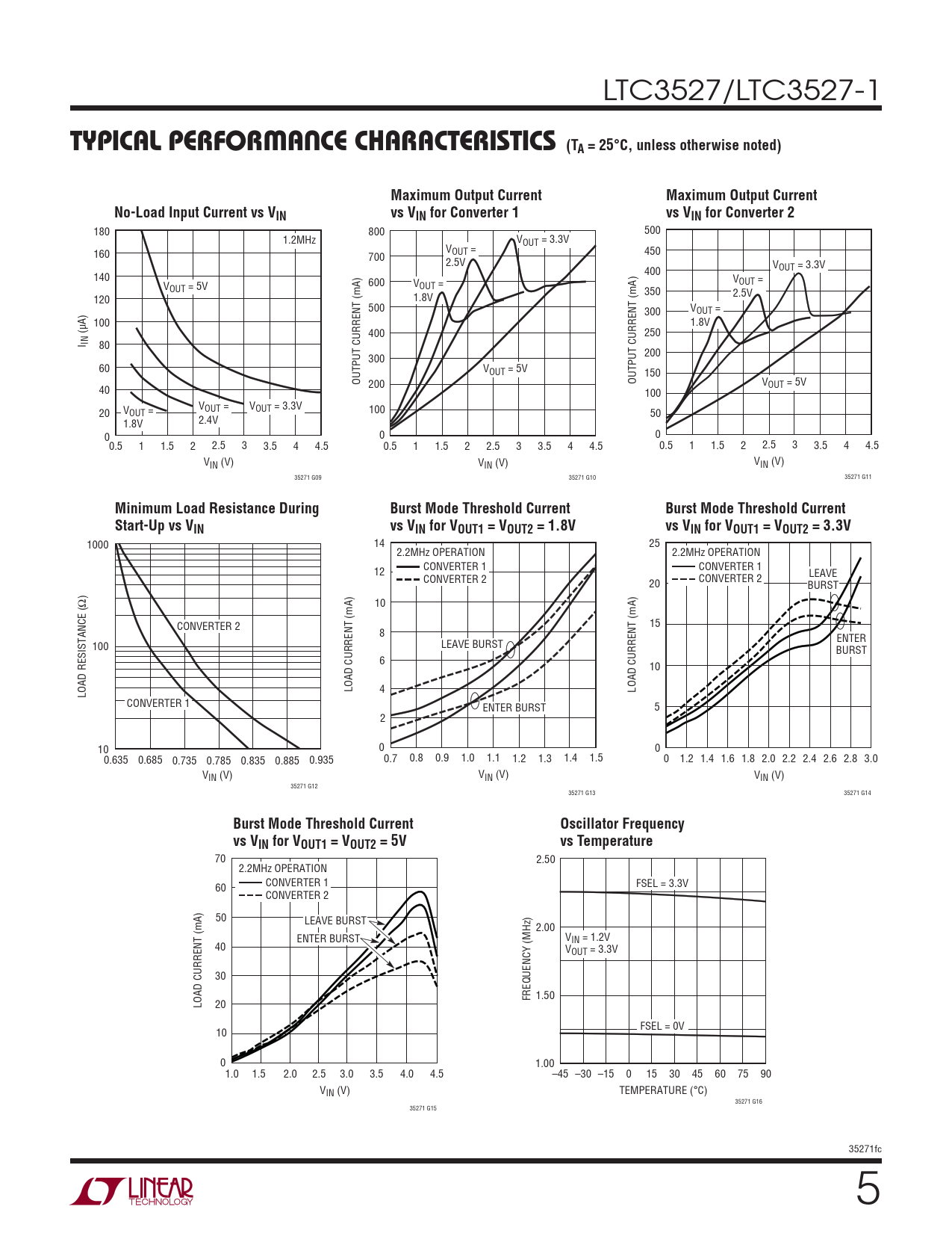 70 2.50 2.2MHz OPERATION CONVERTER 1 FSEL = 3.3V 60 CONVERTER 2 50 LEAVE BURST 2.00 ENTER BURST VIN = 1.2V 40 VOUT = 3.3V 30 FREQUENCY (MHz) 1.50 LOAD CURRENT (mA) 20 FSEL = 0V 10 0 1.00 1.0 1.5 2.0 2.5 3.0 3.5 4.0 4.5 –45 –30 –15 0 15 30 45 60 75 90 V TEMPERATURE (°C) IN (V) 35271 G16 35271 G15 35271fc 5